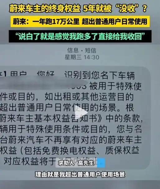 “彻底解释不清了!”河南的高先生最近那叫一个郁闷,开着花了近60万买的蔚来车出门,突然就收到车企警告,终身权益被收回,理由竟是一年跑了17万公里,超出普通用户日常使用,怀疑他有不正当开车行为,比如出租或营运。这事儿就像一颗“炸弹”,瞬间在汽车圈炸开了锅。 时间回到2020年,那时候新能源汽车还没像现在这么火。高先生在众多车子品牌和车型里挑花了眼,唯独看中了蔚来ES8。家里人都劝他再考虑考虑,毕竟这车是新能源,当时买的人可不多。但高先生就像着了魔一样,认定了这台车,一咬牙就花了快60万把它开回了家。 有了这辆车,高先生那叫一个得意。每次出门都开着它,根本不用担心费油去加油站排队,而且车子起步快还不抖动,发动机声音也不大。唯一有点小麻烦的就是,跑一定公里数就得充电,不过好在到处都有充电桩,充个几十分钟又能继续“撒欢”。 高先生觉得自己眼光超棒,这车买回来后,好多人都跟着入手了新能源汽车,买蔚来车的人也越来越多。他更是到哪儿都开着这辆蔚来,就想着好好享受那终身免费换电和质保权益。反正电瓶不行能免费换,他去年一年就跑了17万公里。 这平均下来,一天得跑465公里呢!在旁人看来,这跑得也太夸张了,天天能跑哪儿去啊?但高先生觉得,自己就是喜欢开着这车到处跑,没啥问题。 可谁能想到,车子开了5年,到今年7月的时候,突然就被“没收”了终身权益。蔚来给出的理由是识别出车辆超出普通用户日常使用场景。这可把高先生气坏了,就因为跑得多就要取消权益,这不是欺负人吗? 这事儿一曝光,网友们可炸开了锅。一部分网友站在车企这边,他们觉得一年跑17万公里,这哪是正常家用啊,分明就是运营车嘛! 合同里也明确说了不能作为运营车,免费换电和保养肯定不能给运营车用啊。要是都这样,车企不得赔得“底儿掉”?一年17万,两年34万,开三年都够再买一辆新车了,这账算得明明白白,车企哪能干啊。 不过也有网友觉得高先生挺委屈的。从高先生的态度来看,他好像真没有把车拿去出租或营运。那他一年跑17万公里,到底是怎么跑的呢?咱们来分析分析。说不定高先生是个超级爱自驾的人,一年到头都在全国各地自驾游,今天去海边看日出,明天去山里呼吸新鲜空气,一天跑个几百公里那也是常有的事儿。 或者他的工作性质比较特殊,需要经常跑长途,比如是个销售,全国各地跑业务,一天跑好几个城市,这公里数不就蹭蹭往上涨了嘛。要是这样,那他的用车方式虽然超出了一般人的范围,但也不能就说他不正当啊。 再看看其他新能源车企的终身权益政策。有的车企对使用里程就没有这么严格的限制,只要符合一些基本条件,就能享受终身权益。还有的车企虽然也有规定,但相对宽松一些。蔚来这次这么一搞,在行业里可算是“独树一帜”了。 这会不会引发其他车企的连锁反应呢?说不定其他车企也会重新审视自己的终身权益政策,看看是不是也要对使用里程做出一些限制。这对消费者来说,可不是什么好事儿啊。 从车企政策制定的角度来看,车企制定终身权益政策的时候,肯定是想吸引更多的消费者。但是,也得保障自己的利益啊。要是都像高先生这样一年跑17万公里,车企的成本可就太高了。不过,这也反映出蔚来的政策制定可能存在漏洞。 在制定政策的时候,没有充分考虑到一些特殊情况,比如像高先生这种超级爱开车或者工作需要经常开车的人。要是提前把这些情况都考虑进去,明确界定一下什么样的用车方式算是正常,什么样的算是特殊,也许就不会出现这样的事儿了。 这事儿对潜在消费者的购车决策也有影响。本来有些人还在犹豫要不要买蔚来或者其他新能源车企的车,现在看到高先生这个事儿,心里肯定得犯嘀咕。 这终身权益政策到底靠不靠谱啊?要是自己以后用车比较多,会不会也被车企收回权益啊?车企可得好好想想怎么应对这种影响,不然以后消费者都跑别家去了。 现在,蔚来工作人员也在积极向上级反映,说要给高先生一个满意的答复。咱们就拭目以待吧,看看这事儿最后会怎么解决。 大家觉得一年跑17万公里合理吗?是高先生太“任性”,还是车企太“抠门”呢?快来评论区说说你的看法吧! [免责声明]文章描述过程、图片都来源于网络,此文章旨在倡导社会正能量,无低俗等不良引导。 如涉及版权或者人物侵权问题,请及时联系我们,部分内容可能存在杜撰和虚构成分,请注意甄别 如有事件存疑部分,联系后即刻删除或作出更改]