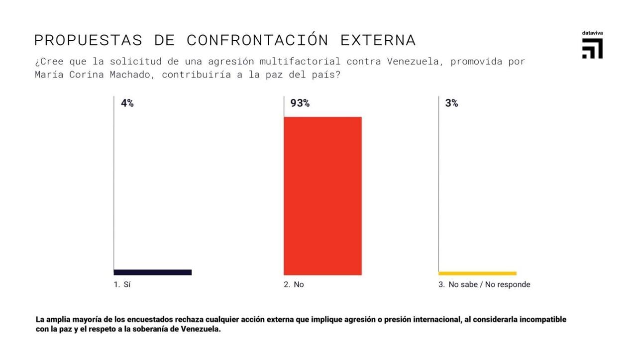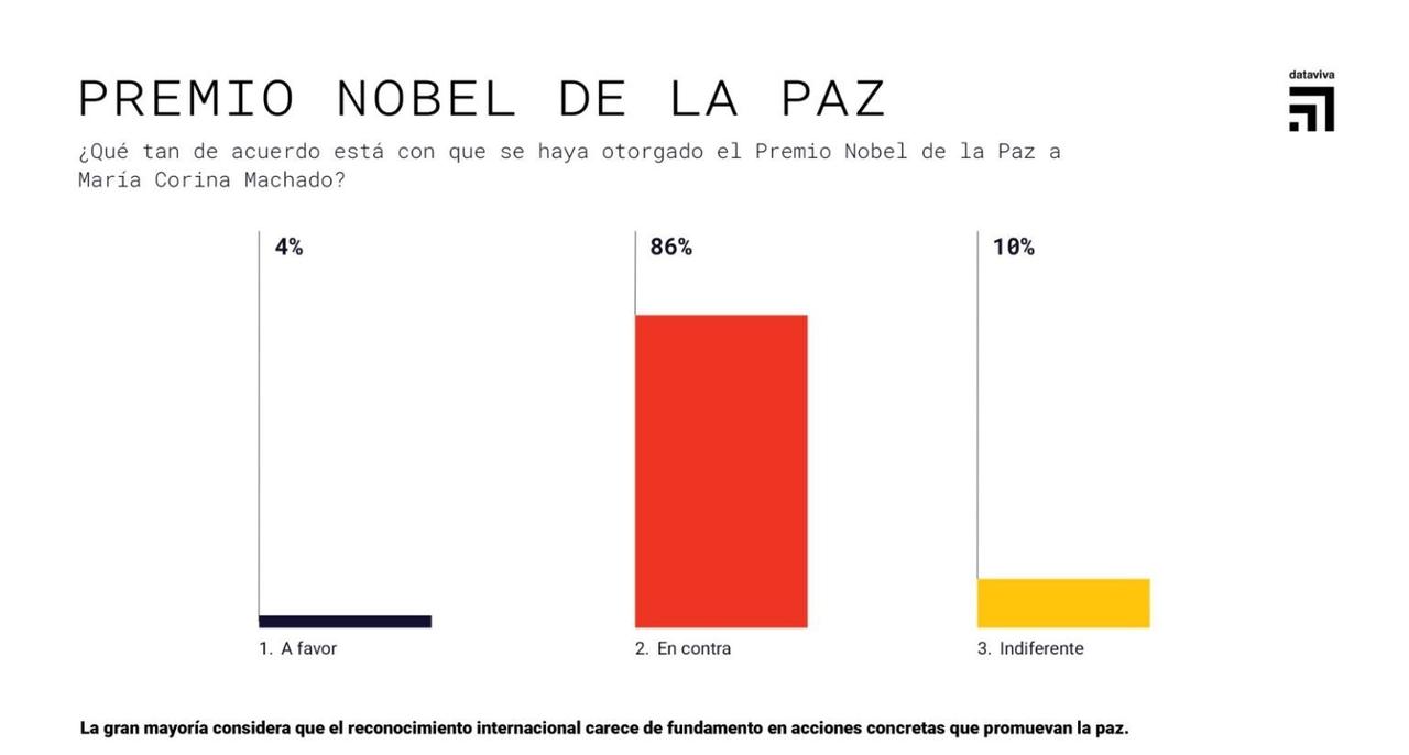 📊 委内瑞拉民调机构“达塔维瓦”于10月10日(周五)对1500名委内瑞拉开展的最新全国民调显示,84%的委内瑞拉人认为,极右翼反对派头目 玛丽亚·科里娜·马查多 从未为委内瑞拉的和平作出过任何努力。 “达塔维瓦”的这项民调针对委内瑞拉成年群体,通过电话访谈进行,且样本按地区、性别和年龄组进行了分层抽样。结果显: 84%的受访者认同“玛丽亚·科里娜·马查多未为国家和平做过任何事”的观点 另有6%的受访者表示她“做过努力” 剩余10%未作答 (第二个问题:)您认为玛丽亚·科里娜·马查多推动的“对委内瑞拉发动多方面攻势”的诉求,会有助于该国和平吗? 对于这第二个问题,多数受访者表示反对任何涉及外部攻击或国际施压的外部行动,认为这类行动与委内瑞拉的和平及国家主权的尊重相抵触。 93%的受访者表示反对。 4%的受访者认同对委内瑞拉发动攻势。 3%的受访者表示“不知道”或未作答。 (第三个问题:)您在多大程度上认同向玛丽亚·科里娜·马查多授予诺贝尔和平奖这一做法? 86%的受访者认为,国际社会对玛丽亚·科里娜·马查多的这一认可“缺乏依据”,因为她并无推动和平的具体行动 4%的受访者表示支持这一授奖决定 剩余10%的受访者对第三个问题持中立态度。 玻利瓦尔英雄之地超话