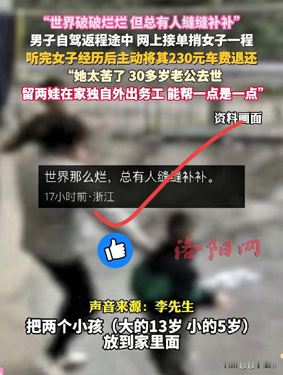 河南民权这大哥的操作,看完真的暖到心窝里!自驾返程想捎人凑点油钱,收了大姐230块车费,最后居然又全退回去了,就因为知道了大姐的难处。 大姐才三十多,去年没了丈夫,俩孩子一个13岁一个才5岁,自己孤零零外出打工,车上跟孩子视频时哭得不行,大哥看了哪还忍心要这钱。送到厂门口把钱塞回去的时候,哪是退车费啊,明明是给难中人递了份温暖。 网友说的太对了,单亲妈妈最缺的就是这份体谅,不是钱多少的事儿,是这份心意能让人撑好久。这世上哪有那么多惊天动地的善举,都是普通人在别人难的时候,伸了把手而已,可就这一下,就够暖好一阵子了!