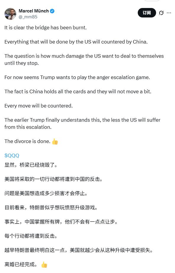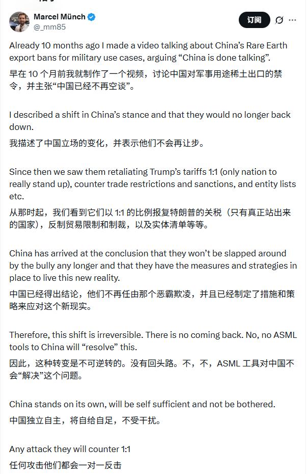 【8年河东8年河西,西方大儒劝川普:现在向中国“投降”代价最小】 历史总爱开玩笑。2018年中美贸易战正酣,国内某马姓大V抛出“向美国投降是代价最小的时候”,引发全网声讨,最终删文销号。 谁想到仅仅8年后,类似台词竟从西方学者口中说出——欧洲企业家马塞尔·明奇近日连发帖文,直言“美国应尽早认清现实,现在向中国低头,才是代价最小的选择”。 他犀利指出:中国已掌握所有筹码,不惧对等反制。川普越是“愤怒升级”,美国损失只会越大。“中国已不再容忍霸凌,这一转变不可逆转。” 同样用“投降”二字,同样是劝人“认清现实”,同样是“现在不投将来跪都来不及”的逻辑。只不过主语宾语彻底对调了而已。 当年那位马姓大V称“中国一百年内超美没可能”,今天马塞尔判断“美国适应中国崛起还需15到20年”。一场贸易战,打出了实力对比的逆转,也打出了国际舆论的转向。 回旋镖虽迟但到,8年时间,攻守易形。 连西方大儒都劝美国要识时务了,不知道当年那些唱衰中国的人,此刻又会作何感想呢?