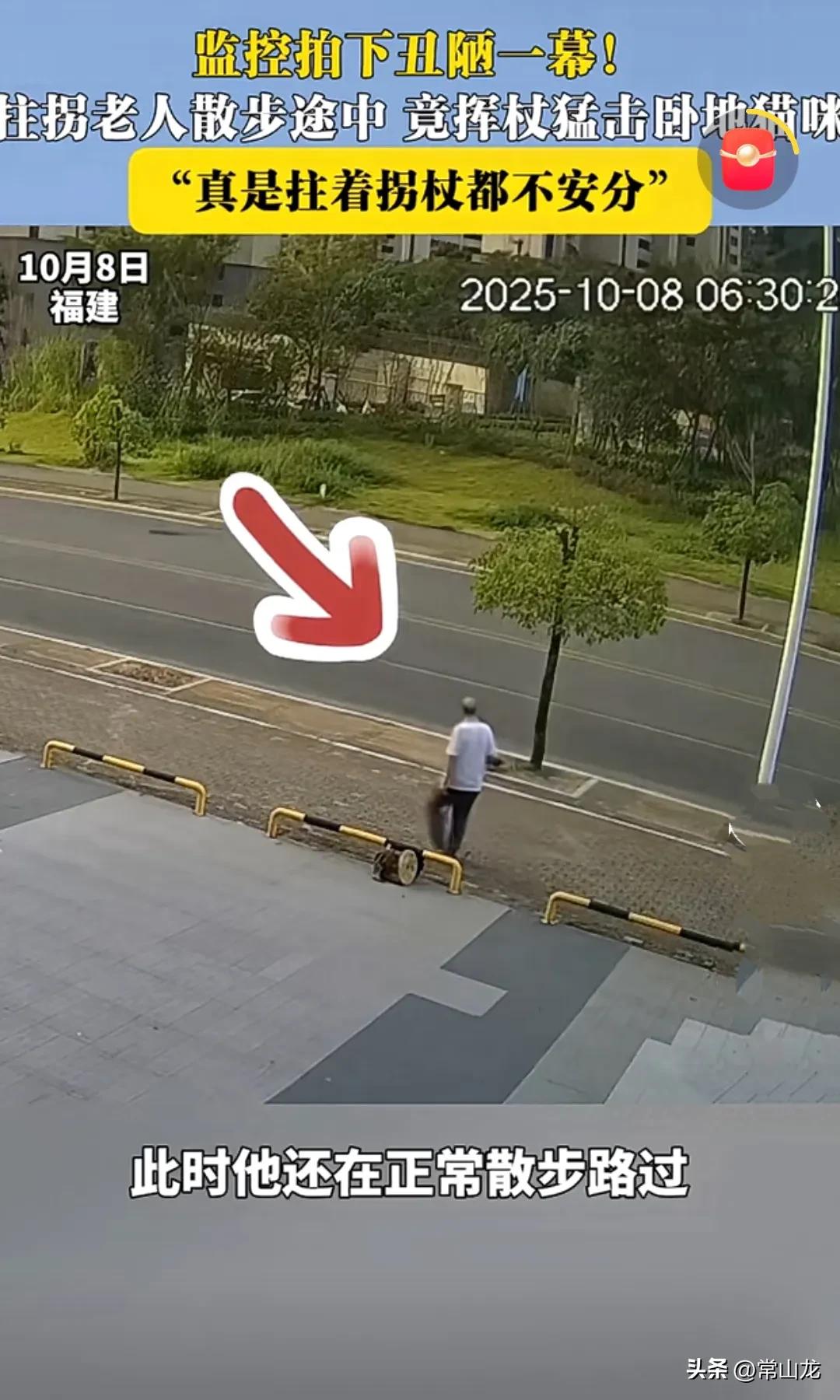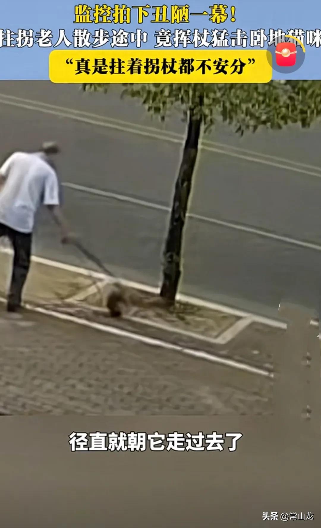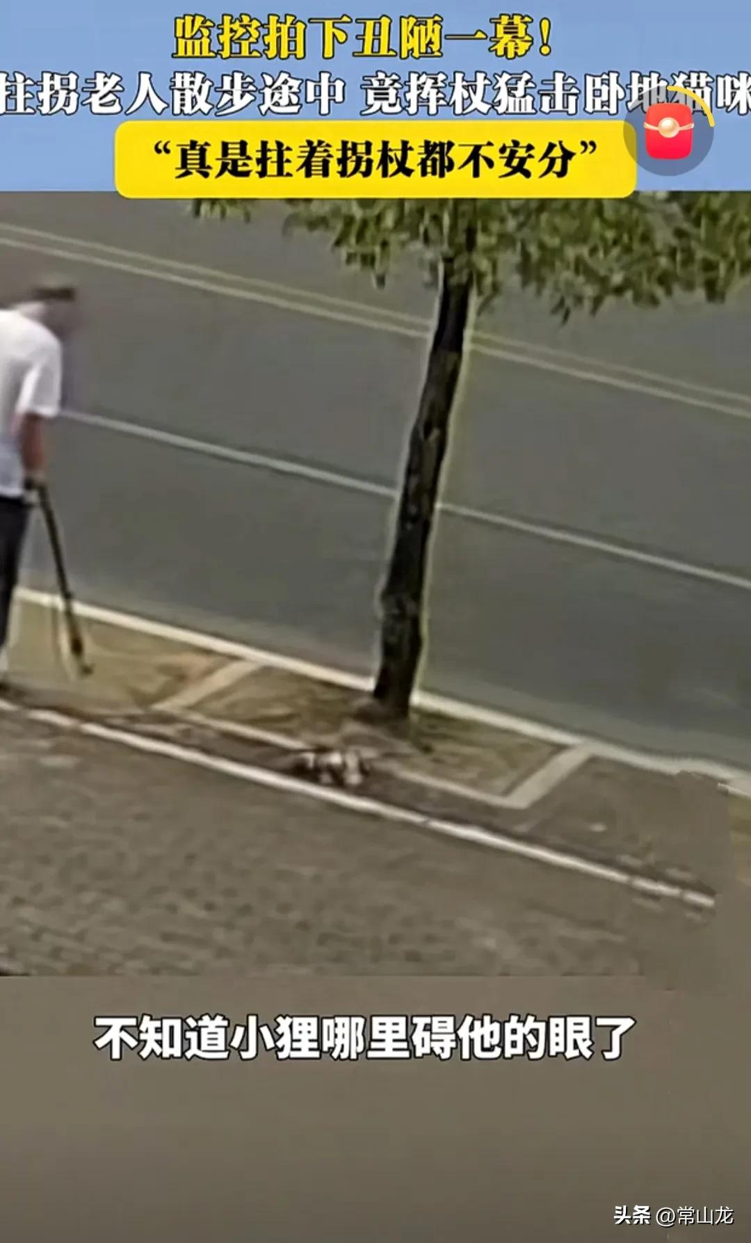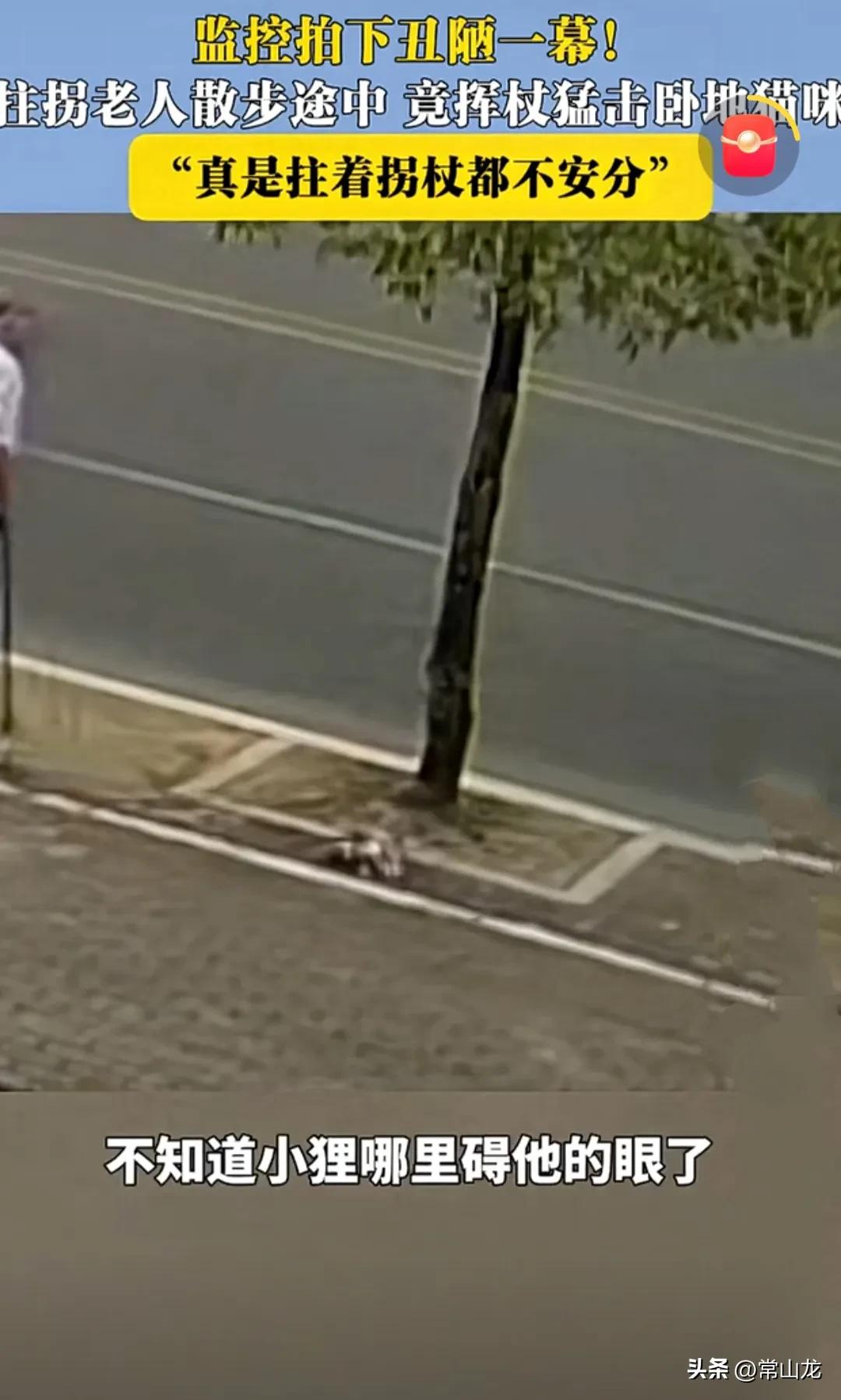 老头拄着拐杖走在人行道上,无意中看到栽种行道树的土壤里,趴着一只瘦弱的狸花猫,显然,这是一只无主的流浪猫。 老头不知怎么想的,径直朝小猫走了过去。 猫咪可能经常被人投喂,也不怎么怕人,看到老头走过来也不跑开,还友善地向他摇了摇尾巴。 老头走到猫咪身边,突然挥起拐杖用力向猫咪打去,击打后还回头看了一眼身后的店铺。 可怜的猫咪,好好的趴在地上,没有妨碍到任何人,却遭此无妄之灾。 老头这一拐杖重重打在猫咪肚子上,猫咪被打得发出凄厉地惨叫,不停地在地上抽搐乱滚,小便都被打得失禁了。 店员看到这一幕,连忙大声呵斥,老头才心有不甘地悻悻走开。 怎么会有这么缺德的人,小猫咪怎么碍到你了,你要下此毒手。 难道是因为自己风烛残年、行将朽木,就对一切年轻的生命心怀怨恨。 有人说视频掐头去尾,老头打猫可能是有原因,也许这只猫是店铺饲养的,而店老板得罪过他,于是他就拿猫咪撒气。 那样就更过分了,你跟老板有过节,直接去找老板呀,干嘛在一只弱小无辜的猫咪身上撒气,不怕给自己折寿吗,你的行为给子女长脸了。 万物皆有灵,可以不爱,但请不要伤害,善待动物就是善待我们自己。 希望这只猫咪得到好心人救助。