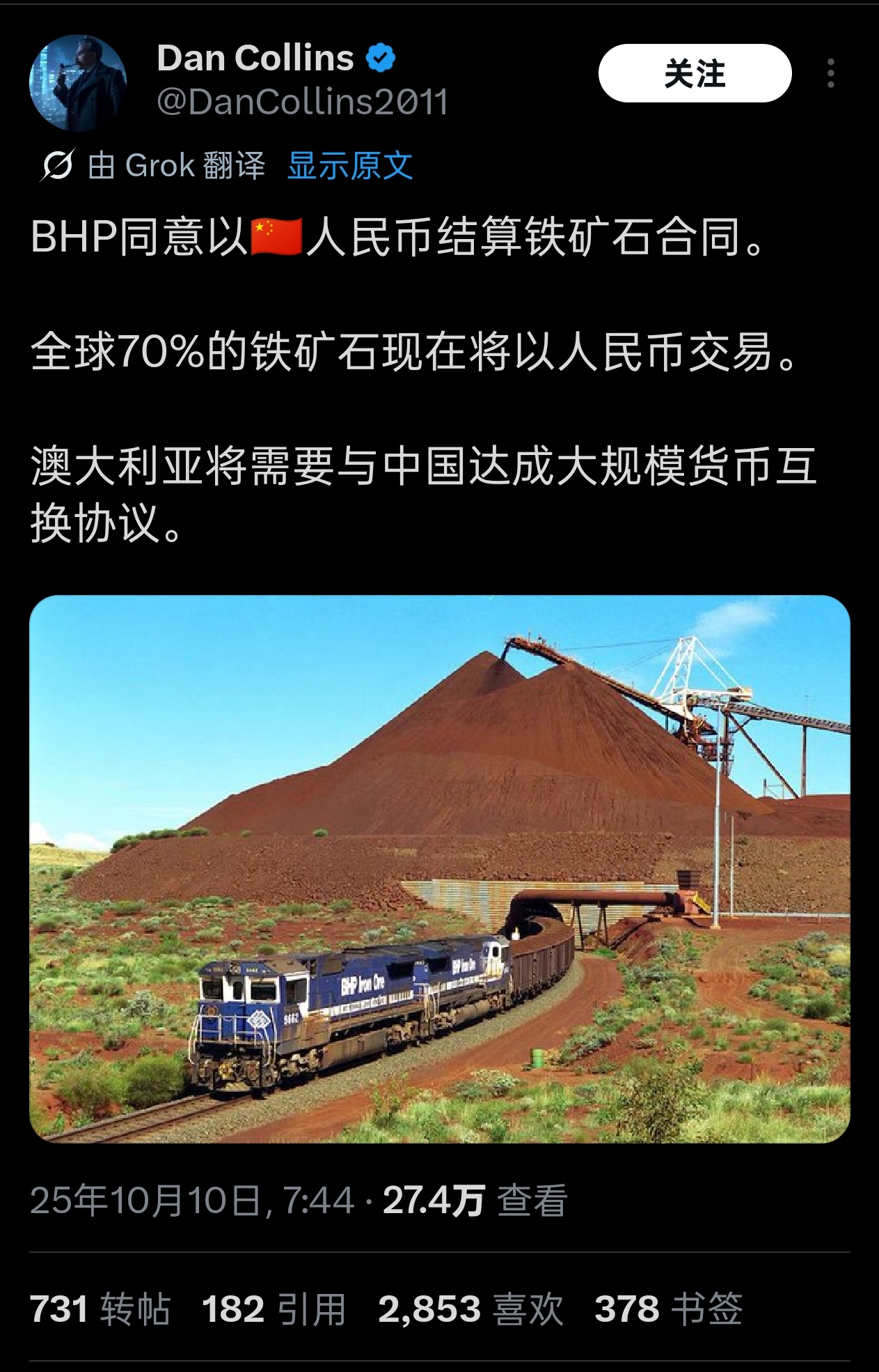 必和必拓同意从第四季度开始正式想与东大进行人民币铁矿石交易[并不简单]东大最近
