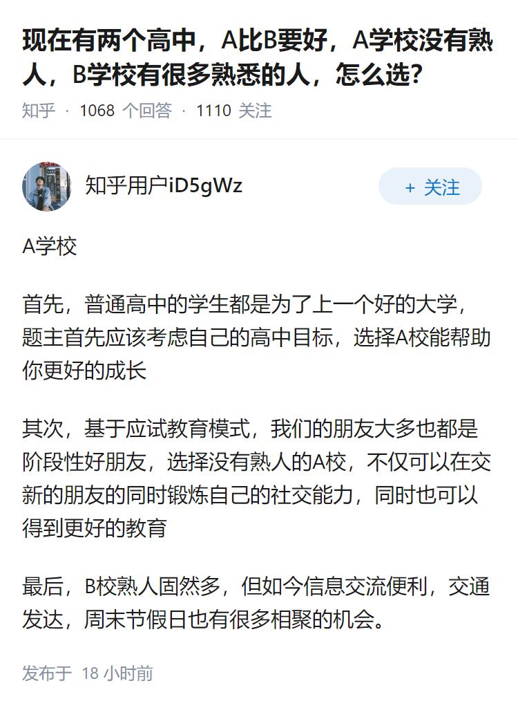 现在有两个高中,A比B要好,A学校没有熟人,B学校有很多熟悉的人,怎么选?