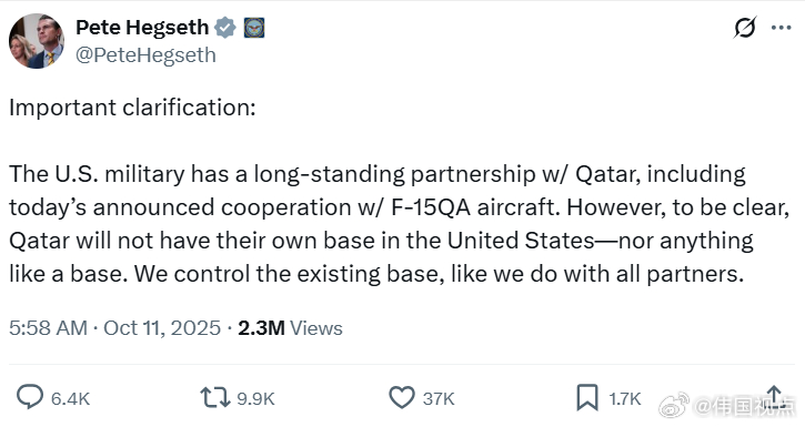 重要澄清:美国军方与卡塔尔有着长期的合作关系,包括今天宣布的与F-15QA飞机的合作。然而,需要明确的是,卡塔尔不会在美国拥有自己的基地——也不会有类似基地的东西。我们控制现有的基地,就像我们对所有合作伙伴所做的那样。