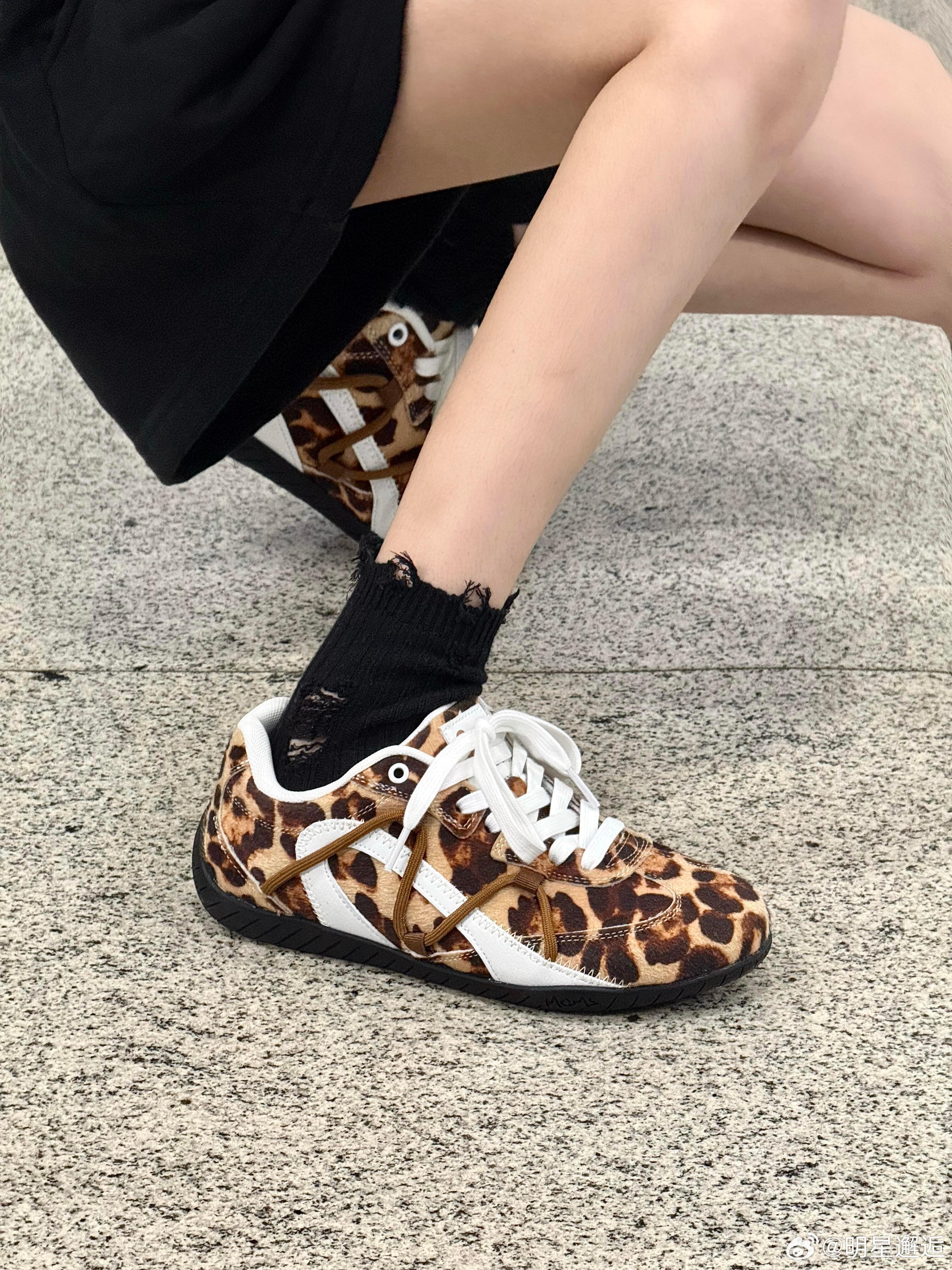 这双豹纹运动鞋无疑是整体造型的视觉焦点,完美诠释了狂野不羁的街头时尚。鞋身以棕褐色为主调的豹纹图案覆盖,强烈的野性美感呼之欲出,而洁白的鞋带与厚实的黑色鞋底则巧妙地平衡了视觉冲击,增添了层次与稳定感。