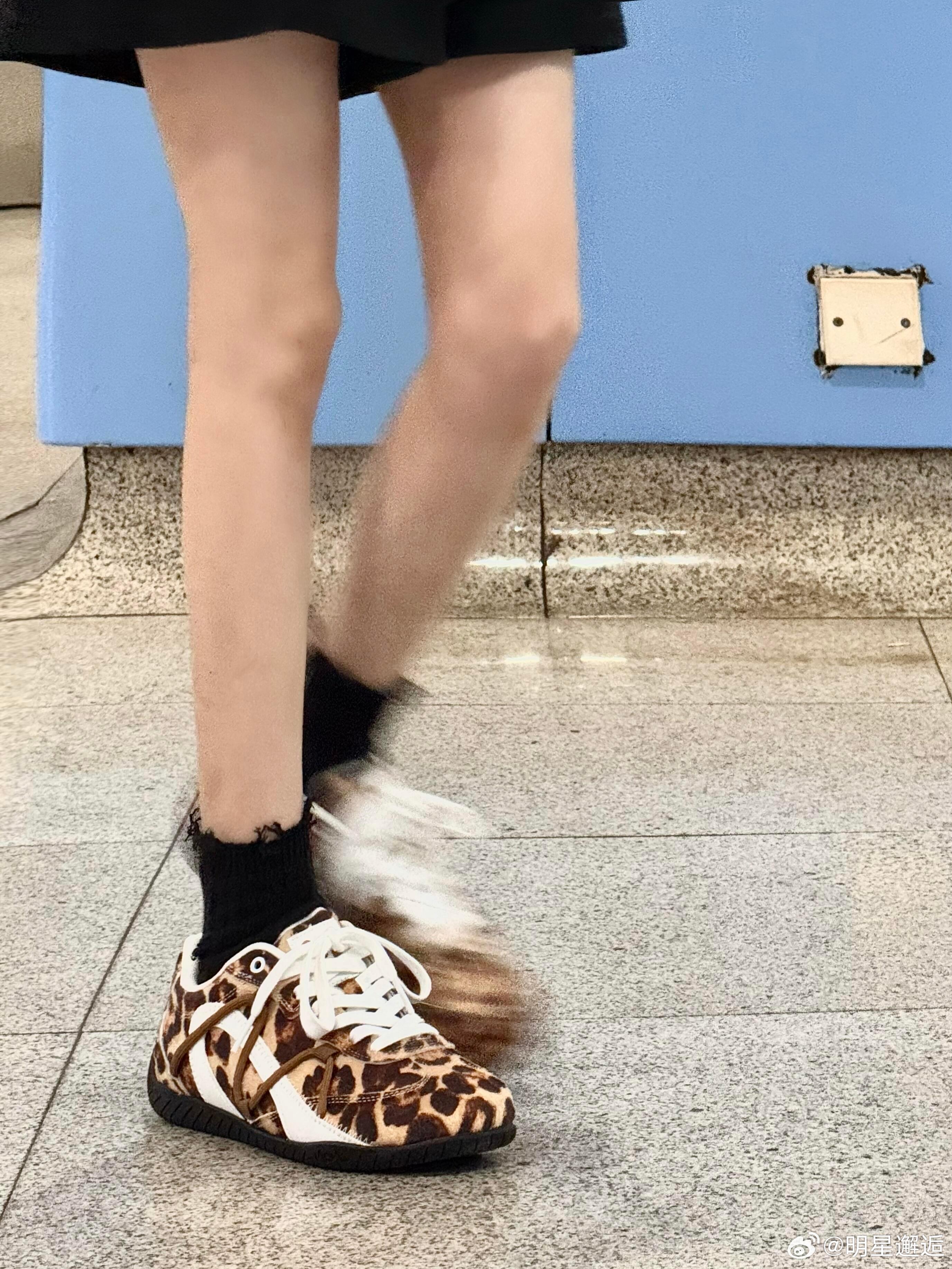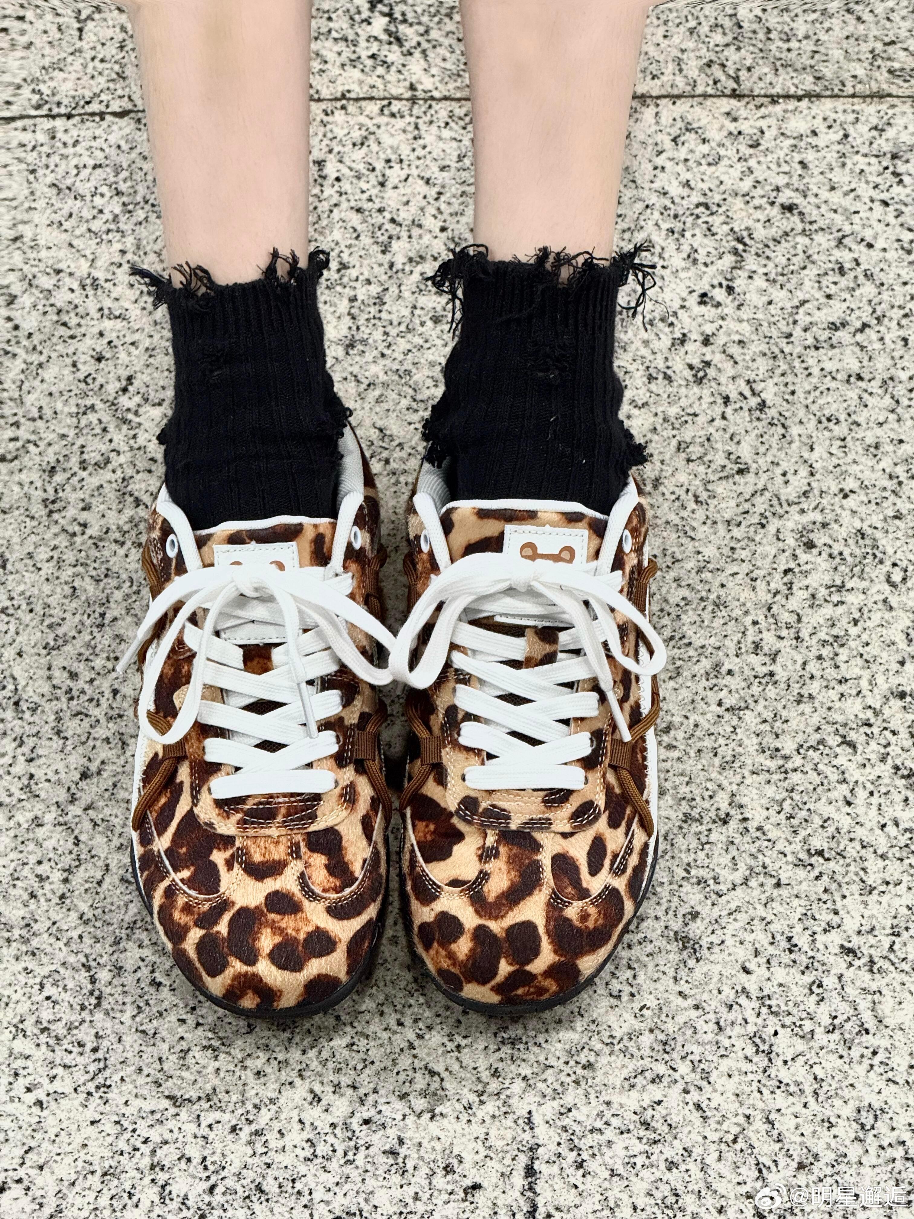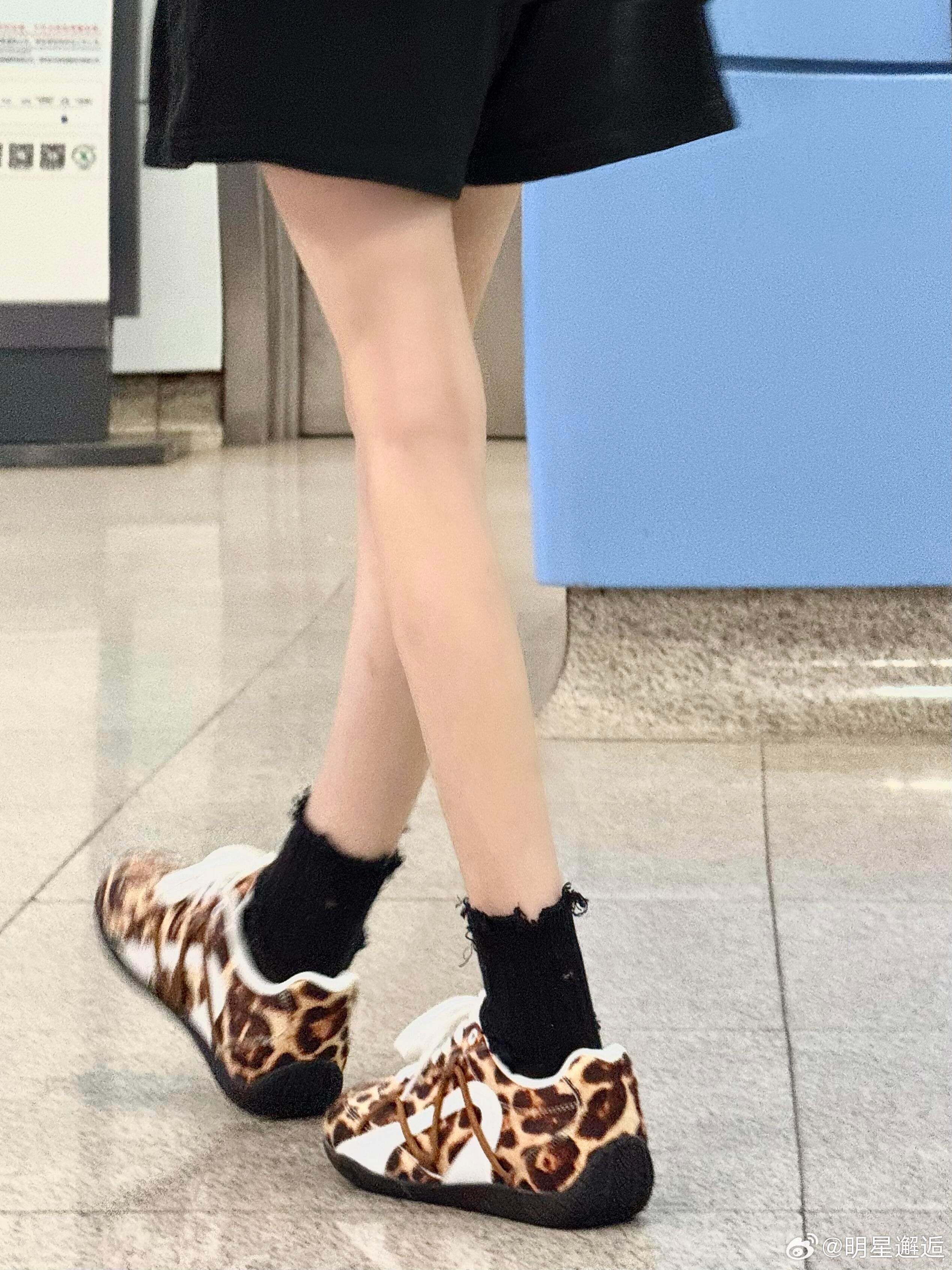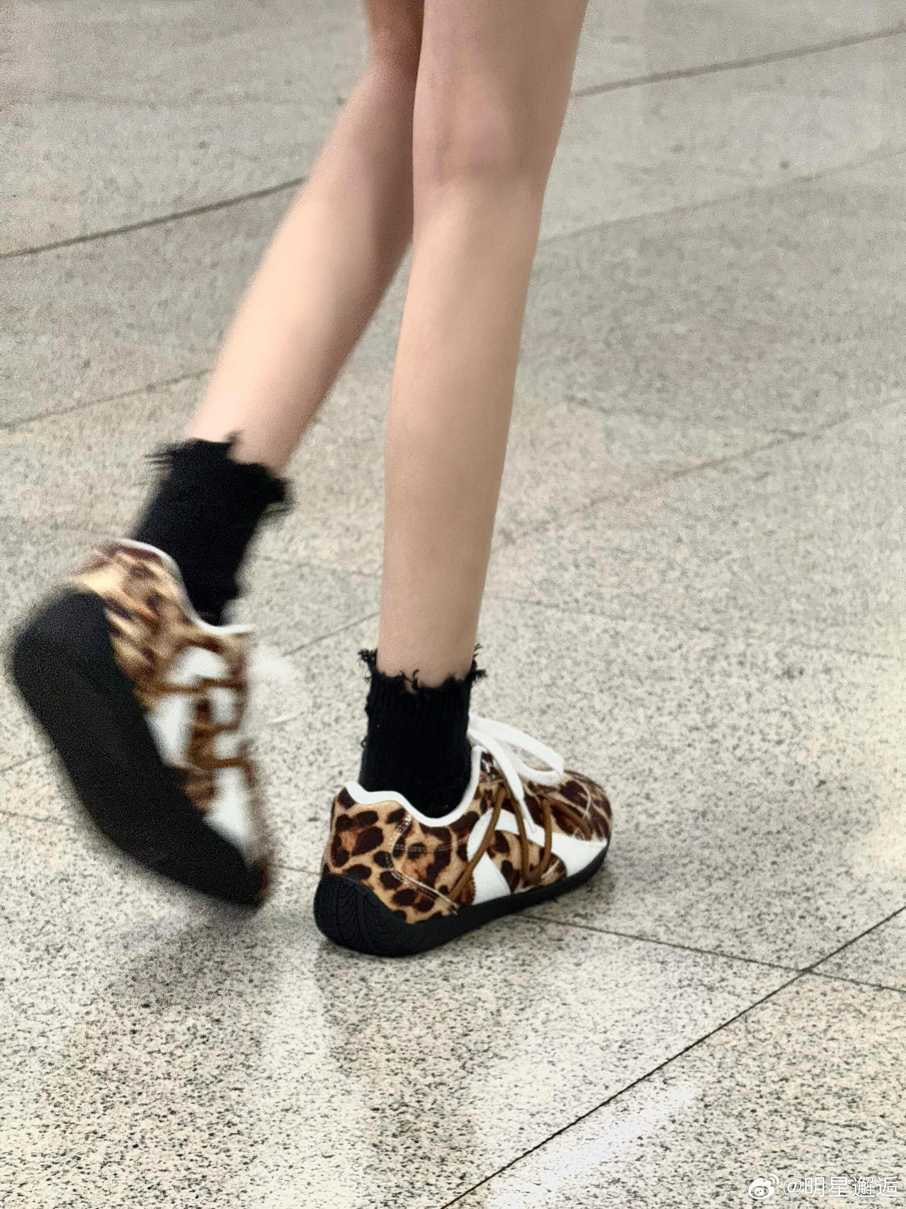 搭配的黑色毛绒短袜不仅提供了舒适的脚感,其独特的质感更与豹纹的张扬相得益彰,共同营造出丰富的触觉对比。画面捕捉到行走间的动态瞬间,为静态展示注入了活力。鞋子置于浅灰色带有细腻斑点的大理石纹理地面上,冷峻的背景更加反衬出豹纹的温暖与夺目。时尚鞋履SOTD鞋控的日常