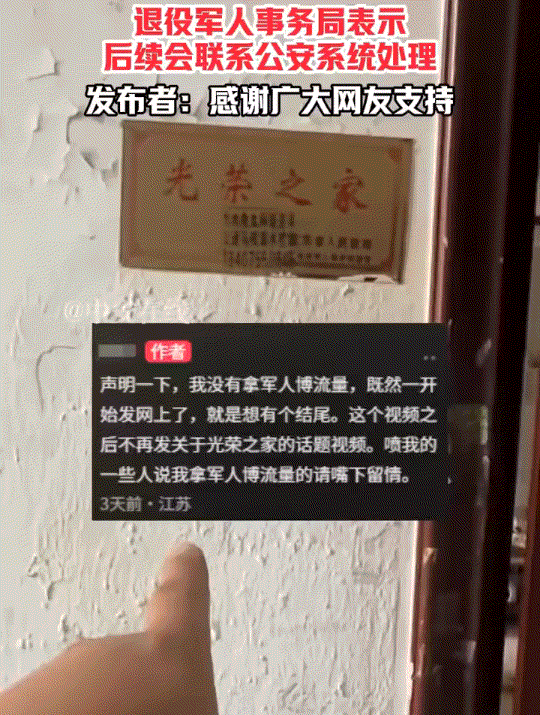 江苏,一退伍军人大哥家门口,贴着一张“光荣之家”的牌子,结果这天大哥出门时,竟看到有人在牌子上印了一个小广告。为此大哥很心疼牌子被弄脏,因为虽然他已退伍11年了,但大哥一直很珍惜这份荣誉。随即大哥擦干净了牌子上的小广告,并无奈的表示:这么大的空白地方不盖,却偏偏要盖在光荣牌上,这种侮辱或损坏光荣之家的牌子的行为是违法的呀! 而此事被发到网上后,也是引起了网友们的关注,这退役军人事务局也注意到了此事,并表示后续会联系公安系统处理。而贴小广告的对方,可能也意识到问题严重性,赶紧打电话向大哥诚恳道了歉。 对此大哥也大度的表示,这个事情就这样过去吧,发视频也是提醒大伙,不要随意破坏光荣牌,因为这不止是一块普通的牌子,更是一家人的荣誉!并感谢了广大网友支持和关心。 要知道,这光荣牌是退役军人、烈属、军属等家庭的国家荣誉标识,它不止是个普通的牌子,更是受《退役军人荣誉标识使用管理办法》严格保护。 条例中就有规定,禁止任何组织或个人对光荣牌进行丑化、玷污、破坏等有损其形象的活动,包括张贴无关物品。 且光荣牌具有庄重性和象征意义,其悬挂和管理由退役军人事务部门统一负责,非经批准不得擅自改动。 像这种在光荣之家的牌子上贴小广告是违法的行为,这既违反了退役军人荣誉标识的保护规定,也触犯了城市市容管理相关法律,可能面临罚款等行政处罚。 不得不说,这贴小广告的行为也太过分了吧!本身乱贴小广告就已经违反城市管理条例,此人竟还无知的在光荣牌贴!正如网友所说,虽然道歉态度很诚恳,但既然违法了就应该公事公办,让其受到相应的法律制裁,以示警惕!