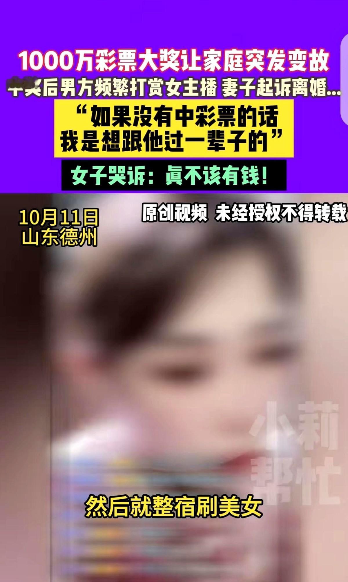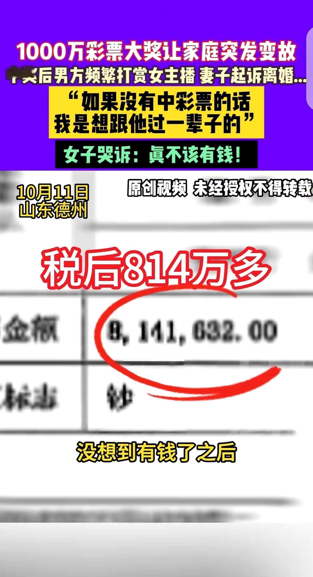 “真不该有钱!”山东德州,一男子花42元买彩票,竟然中了1000万,税后得了814万。 他给老婆一张卡,说里面存了300万,妻子信以为真,可她发现男子从此就飘了,给不同女主播打赏了120万,妻子去银行一查,才发现男子给的卡里余额为0。 妻子大怒离婚,要求男子必须把814万分她一半。 中彩票的钱属于夫妻共同财产,离婚的话至少得分一半。 男方隐瞒资金真实去向,将120万元用于打赏女主播等个人享乐,属于恶意挥霍。 苑女士在离婚诉讼中可主张男方少分或不分共同财产。 根据《民法典》,苑女士不仅有权分得一半奖金,还可主张因男方过错导致的额外赔偿。 网友对此表达观点: 这就是穷人不能有横财。就像英国一个小伙子一样,彩票中了1000多万英镑,就开始各种高消费,豪宅豪车,狐朋狗友经常聚在一起,无聊的时候还玩砸车,到最后一无所有。 像这个山东男子一样,没有过有钱日子的命,钱来得太快,不知道挣钱也很难,加上没有规划,又想体验有钱人的生活,而且还欺骗自己的妻子,这样的人真的不应该有钱。 我三年都没买彩票了,现在又想骗我去买彩票,没门[捂脸][捂脸][捂脸] 有些人可以有財,但從玄學講,他沒有财库可放,只有折騰岀去,不管什麼財,他才能好好活著 并不是有钱就变坏,而本来就不是正经人,只是没到现眼时,基因早就注定了。