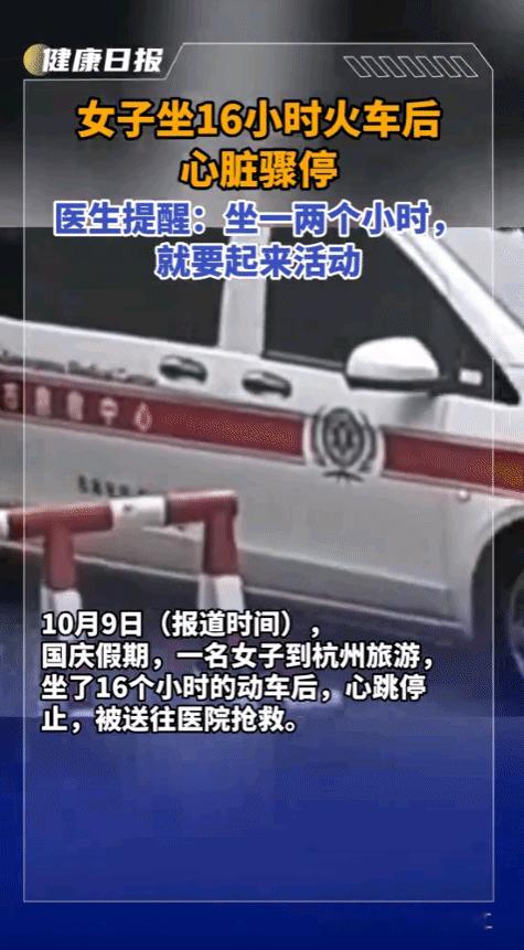 悲剧还是发生了!国庆假期,浙江杭州,一女子坐了16个小时的火车来旅游,下车上了趟厕所后,突然呼吸不通畅、心脏骤停,随后就晕倒在地上!送往医院后,被确诊为“经济舱综合征”,抢救了半个小时才恢复心跳。网友:长时间久坐引起的。 国庆期间,浙江杭州51岁的刘女士(化名)原本是满怀期待地和女儿一起踏上旅程,计划在杭州度过一个愉快的假期,谁知道16小时的硬座之旅成了她生命的转折点。 在狭小的座位上,她几乎没有活动过,加上车厢空气流通差,水分补充不足,这些因素共同导致了血液粘稠度增加,形成了致命的血栓。 10月1日晚,当列车终于抵达杭州站,女子让女儿在出站口等候,自己先去了趟洗手间,就在她从洗手间出来的那一刻,突如其来的眩晕和呼吸困难让她瞬间倒地,女儿见状立即拨打了120急救电话,救护车迅速赶到现场。 但是情况比想象的更为严重,在送往医院的途中,女子的心跳已经停止,到达医院后医生们立即展开了紧张的抢救工作,包括心脏按压、气管插管和人工膜肺等一系列措施,经过惊心动魄的半小时抢救,女子的心跳才微弱地恢复,随后又在医院住了数天才逐渐康复。 医学专家解释,这种被称为经济舱综合征的疾病,实际上是深静脉血栓形成后脱落,导致肺动脉栓塞的危险情况,长时间保持同一姿势不动,特别是在狭小空间内的久坐,会使腿部血液流速减慢,容易在血管内凝结成血栓。 当人站起来活动时,腿部肌肉收缩可能会使血栓脱落,随血液流动至肺部,堵塞肺动脉引发肺栓塞,严重时可导致心脏骤停。 值得注意的是,这种情况并非只发生在飞机经济舱,任何长时间久坐的场景都可能引发类似风险,包括长途火车、大巴甚至长时间办公室工作,更令人担忧的是这类事件近年来呈上升趋势,尤其在长假期间更为常见。 北京协和医院血管外科主任医师在接受采访时指出:很多人认为血栓是老年人的专利,实际上年轻人同样会发生,特别是长时间久坐、吸烟、服用避孕药的女性、肥胖人群,都是高危人群。 那么如何预防这种危险情况的发生呢?专家给出了几点建议:首先在长途旅行中,每1-2小时就应该起身活动一下,哪怕是在座位上做些简单的脚踝旋转、脚尖勾起等动作,也能有效促进血液循环。 要保持充分的水分摄入至关重要,很多人为了避免上厕所的麻烦而减少饮水,这反而会增加血液粘稠度,提高血栓形成的风险。 还有就是长时间久坐要穿着宽松舒适的衣物,避免紧身裤袜也有助于减少血栓风险,对于已知有血栓风险的人群,医生可能会建议在长途旅行时穿着医用压力袜。 这起事件也引发了对公共交通设施人性化设计的思考,有专家建议,长途交通工具应该设计更多活动空间,并在旅程中提醒乘客定时活动和补水。 一位资深旅行医学专家表示:我们总是关注旅行目的地的安全和健康风险,却常常忽视了旅途中的健康隐患,其实一个简单的起身活动,一杯及时的水,可能就是救命的关键。 这次杭州火车站的惊险一幕,无疑给所有人敲响了警钟,在享受假期的同时,别忘了关爱自己的身体,毕竟健康才是旅行和生活的最大前提。 麻烦看官老爷们右上角点击一下“关注”,既方便您进行讨论和分享,又能给您带来不一样的参与感,感谢您的支持!