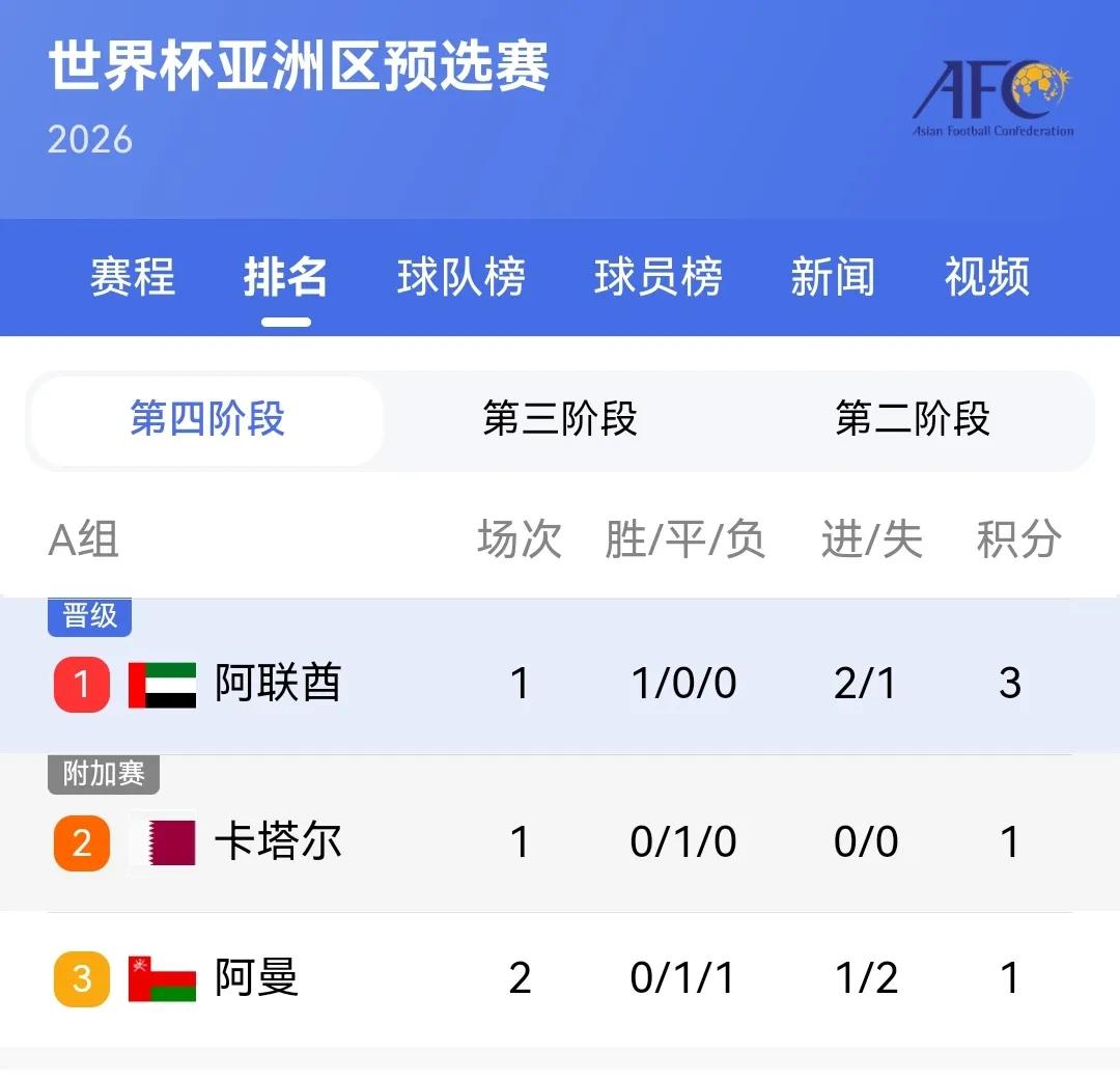 阿联酋主场2比1逆转阿曼,暂居小组头名,卡塔尔积1分第二名,阿曼两轮积1分垫底,