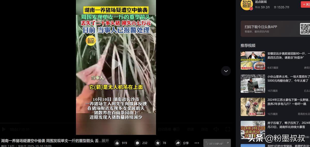 “严查到底!”10月10日,湖南长沙,一养猪场里突然被人用巨型箭头射杀生猪,短时间里就被偷走了20多头大猪,损失高达70000元左右,网友:这种人必须严惩! 你说这养猪多不容易啊?起早贪黑喂料、打扫,就盼着猪能长壮点,到时候卖个好价钱,补贴家用,可湖南长沙的向先生,最近却遭了大罪,他在自家上百亩的茶园山上散养着猪,结果没几天功夫,猪圈里的猪莫名其妙少了二十多头,算下来直接损失了快七万! 更让人后背发毛的是,他在山地围栏外头,捡着好几支沉甸甸的金属箭头,一支就有一斤重,这哪是偷猪啊,简直是带着 “凶器” 的猎杀,网友们看完都气炸了,纷纷喊着 “这种人必须严惩!严查到底!” 向先生一开始还以为是猪跑丢了,毕竟茶园山大地广,偶尔有一两头猪窜到林子深处也正常,可连着好几天,每天都能发现少几头,而且都是长得壮实的大猪,他这才慌了神,赶紧沿着围栏四处找。结果在靠近林子的围栏边,他一眼就瞅见了那几支金属箭头,锃亮的金属杆,前头还有尖锐的头,拿在手里沉得很,一看就不是普通玩意儿。 再往周围找,还发现了几处浅浅的蹄印,像是被人拖拽过的痕迹,这下他心里有了数,这不是跑丢是被人盯上了,用箭头把猪射杀后再偷偷拖走的! 你想想二十多头猪啊,不是小数目,一头大猪少说也值几千块,七万对普通养殖户来说,那是大半年的辛苦钱,就这么被人悄无声息地弄走了,换谁不心疼、不生气? 向先生说之前也丢过一两头猪羊,还以为是野物叼走了,没太当回事,可这次一下子丢这么多,还留下这么吓人的箭头,他夜里都睡不好,总怕小偷再过来。 而且他怀疑小偷可能用了无人机,毕竟茶园太大,靠人翻围栏偷这么多猪太难了,用无人机从天上找猪的位置,再投下箭头射杀,之后趁着夜色把猪拖走神不知鬼不觉的,这手段也太恶劣了。 其实这事儿还真不是个例,之前湖南益阳就有团伙,用无人机挂着热成像仪,大半夜在山里找散养的黑山羊,找到后就从天上投近一米长的金属利器,杀了羊就装车走快得很,江西还有人用无人机追野生蜂群,标记好蜂巢位置,直接跨省去偷,一晚上就能卷走上万元的蜂蛹。 这些小偷现在都不用 “笨办法” 了,玩起了高科技,专挑这种地广人稀、监控有死角的地方下手,养殖户们根本防不胜防。 向先生的茶园上百亩,就算装了监控,也有照不到的林子角落,平时就他和家里几个人照看,白天喂猪、打理茶园就够忙了,夜里哪能时时刻刻盯着?养几条狗吧,狗也有犯困的时候,对付不了天上的无人机。 现在虽说有电子耳标、无人机巡山这些防御法子,可一套电子耳标下来,一头猪就得不少钱,二十多头就是一笔开销,无人机巡山更贵,普通农户哪舍得花这个钱?还有那农业保险,好多都只保猪病死不保被偷,真丢了只能自己认栽这日子过得多憋屈。 不过好在现在警方已经介入调查了,网友们也都在为向先生抱不平,有人说 “这哪是偷,简直是犯罪!必须抓住严惩,让他们赔个底朝天”,还有人说 “得好好查查这些箭头是哪来的,有没有其他同伙,不能让他们再祸害别的养殖户”。 可不是嘛农民辛辛苦苦靠养殖吃饭,攒点钱不容易,就这么被小偷用这么恶劣的手段坑了,要是不严查、不严惩,以后还会有更多人遭殃。 希望警方能早点找到线索,把这些小偷揪出来,不仅要让他们赔偿向先生的损失,还得让他们受到该有的惩罚,给所有养殖户一个交代。 (信息来源:起点新闻——湖南一养猪场疑遭空中偷袭 周围发现单支一斤的重型箭头 丢失了二十多头猪 损失六七万元 目前 当事人已报警处理)
