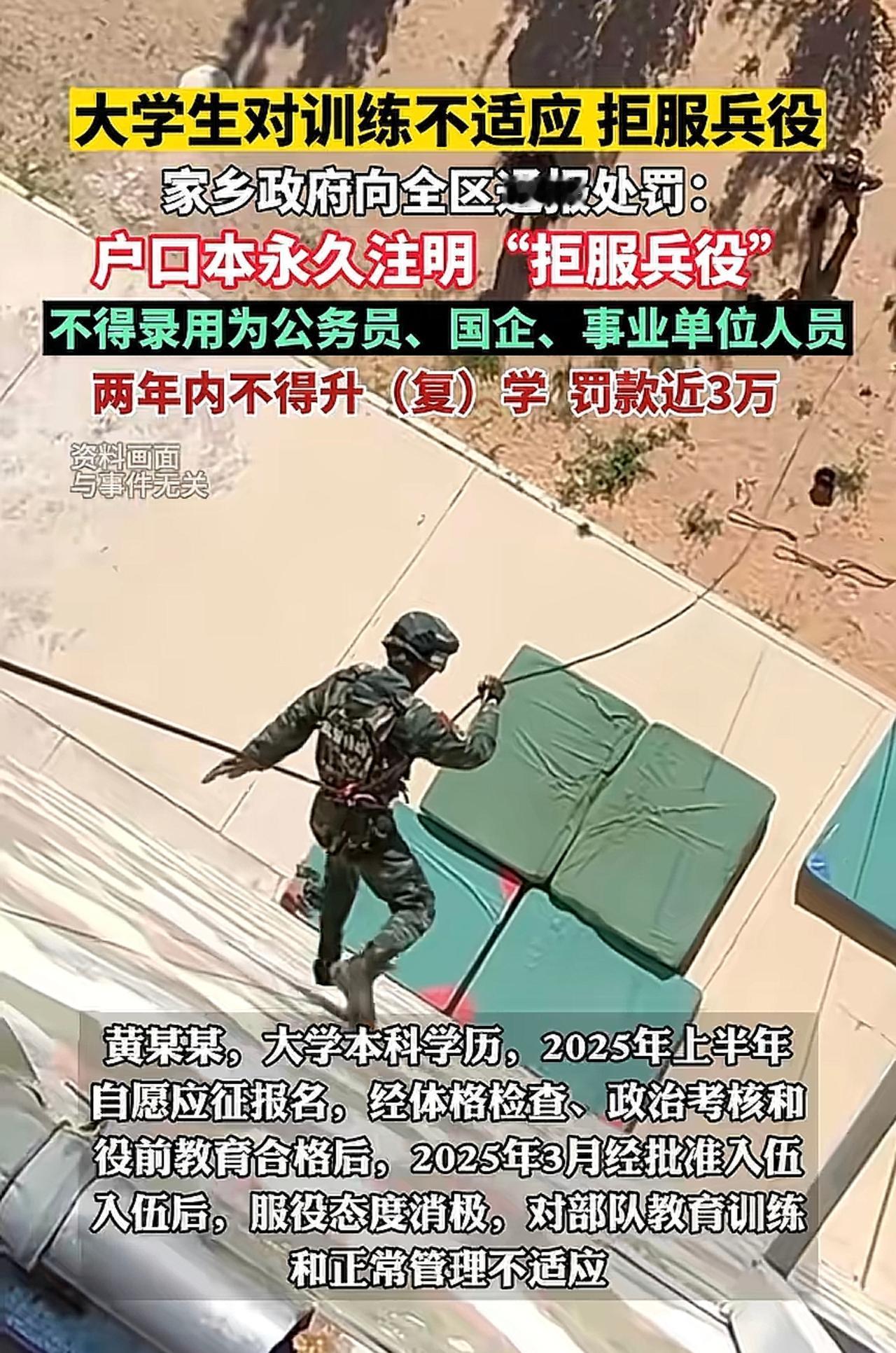 既然选择了参军这条路,就该有走下去的勇气。黄某某自从入伍后,对于部队的各项管理都很不适应,一直态度消极,多次提交退出申请,不论怎么做思想工作,还是仍然坚持离开,别人参军都是全家荣耀,他参军全家变成笑话。