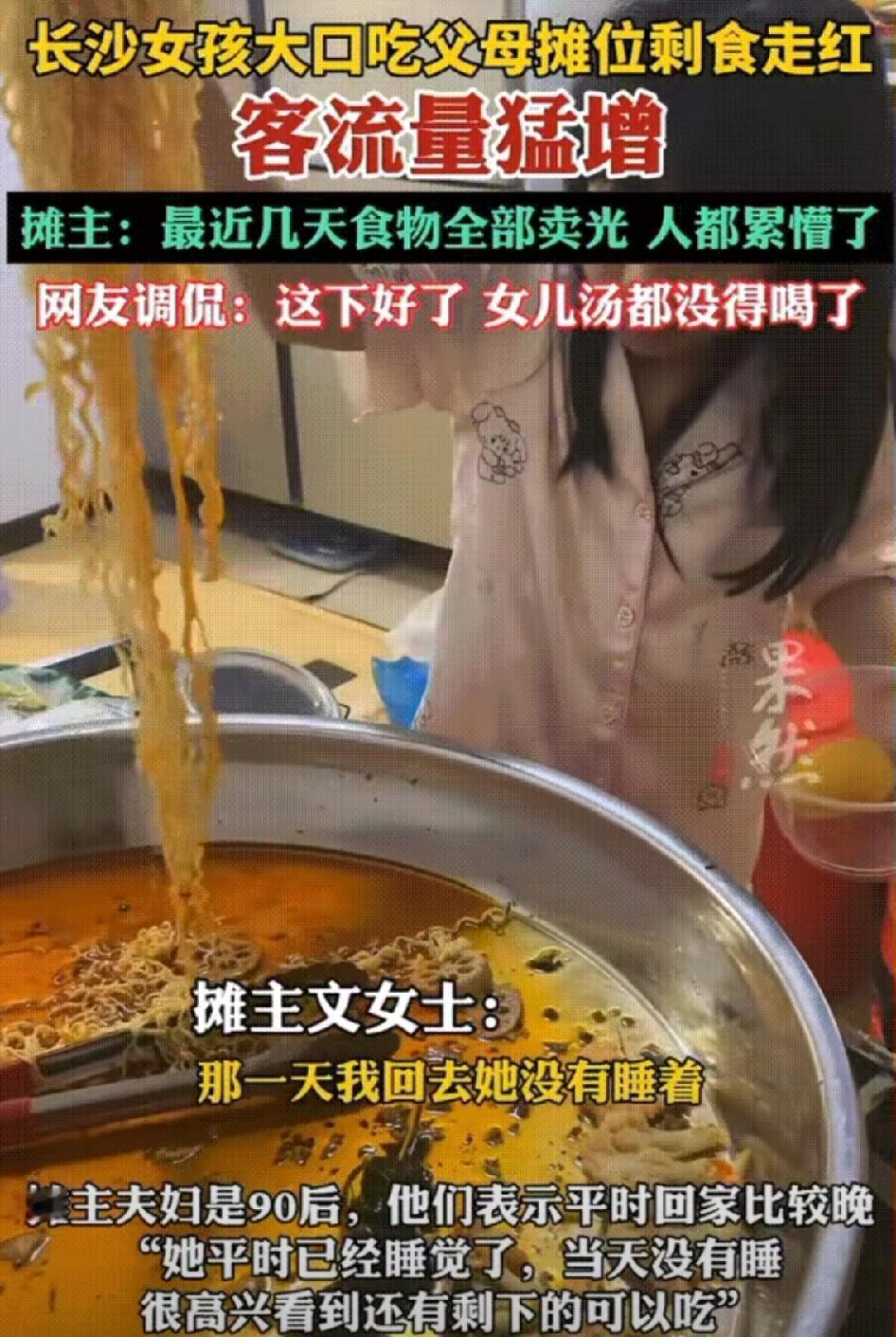 长沙这对卖麻辣小吃的90后夫妻,随手拍了段女儿吃剩菜的视频,居然把生意爆火到累蒙圈! 夫妻俩每天收摊到家都很晚,那天女儿没睡,盯着剩菜和方便面眼睛都亮了,舀一大碗就吃,还说最开心的就是爸妈每天能剩点给她。妈妈本来就是想记录下孩子不浪费粮食,没成想网友一眼看穿关键——要是食材不干净、卫生不过关,谁敢让自家娃吃剩的啊! 就这么个真实片段,直接让他们家小吃摊成了“网红打卡点”,一出摊顾客乌央乌央的,每天都卖光。网友还调侃:这下娃可惨了,以后连剩菜汤都喝不上咯! 其实这事儿特实在,做生意哪有什么花里胡哨的诀窍,把顾客当家人一样对待,用干净食材做东西,口碑自然就来了。你们说,要是身边多些这样实在的商家,是不是咱们出门吃饭也更放心?
