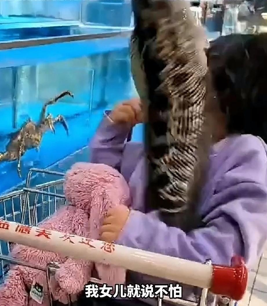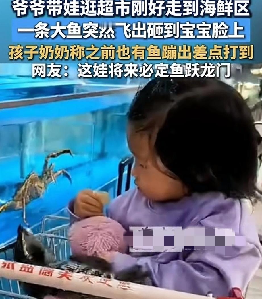 10月12日,河南。爷爷带娃去逛超市。萌娃特喜欢鱼,爷爷就让宝宝坐着超市的购物车,推着她去水产区观看。鱼缸里面养着各种各样的水生动物,有鱼、有虾、还有螃蟹,它们在水里任意的游动。宝宝观赏并陶醉其中。 突然,一条黑鱼从魚缸里面跳了出来。这家伙生性凶猛,也许觉得鱼缸太小,想跳槽,又或许它想跳到别的鱼缸里面去,不巧砸到了宝宝的脸上。 宝宝被鱼拍到,懵了一下,很快又恢复了正常。事后,宝妈问孩子:怕不怕?女儿回答:不怕。 宝宝的奶奶称,之前也有鱼蹦出来,差点打到孩子。宝宝别看年纪小,还真的是见多识广,心理素质过硬,沉得住气遇事不慌。 大鱼突然跳出来砸到宝宝脸上 爷爷带娃