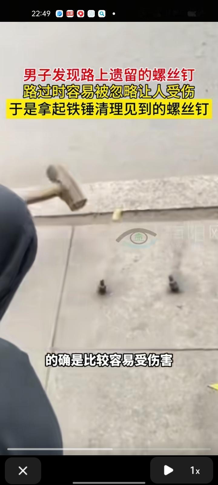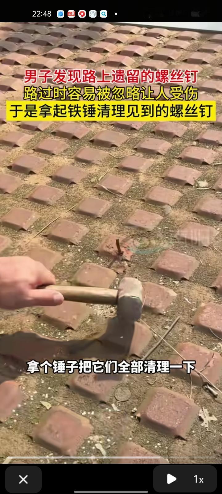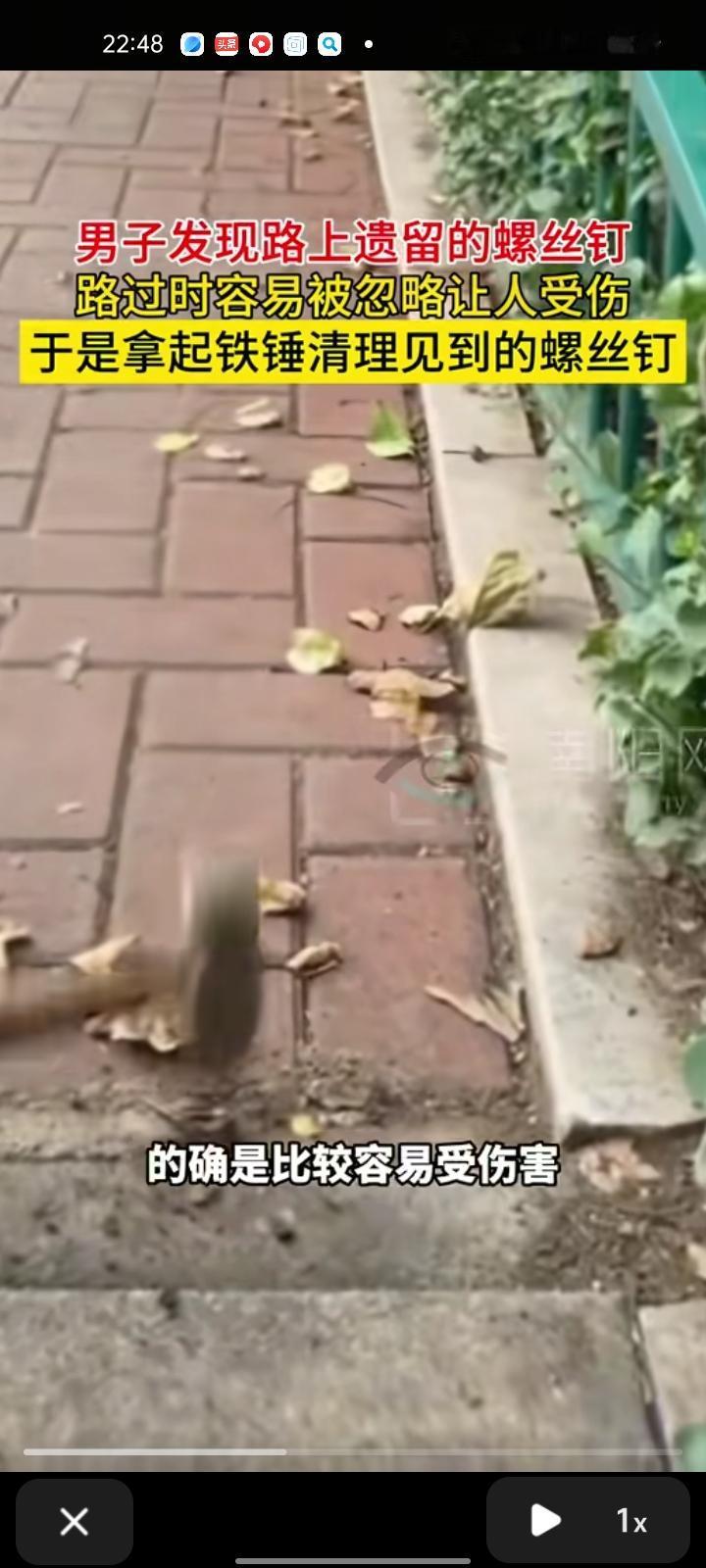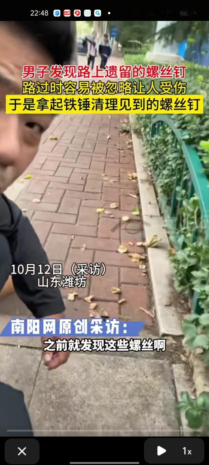 10月11日,潍坊诸城市。男子发视频表示,自己在路上遇到遗留的螺丝钉,行人路过时被忽略而绊倒受伤,于是拿球铁锤清理见到的螺丝钉,现在是哪个地方有就会去清理,保障行人出行安全。