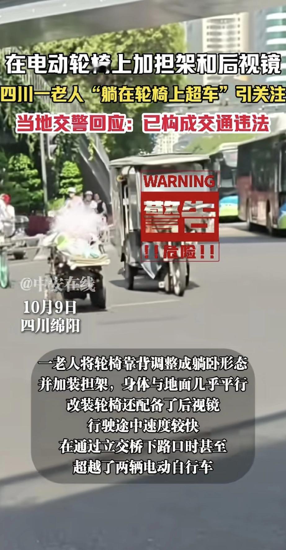 四川绵阳一位大爷可真会玩,他把自己的电动轮椅改装出了新高度——加装担架和后视镜,还把靠背放平,直接躺在轮椅上开。 更让人惊讶的是,他开得还挺快,在路口接连超过了两辆电动车,实现了“躺式超车”。 不过交警已经明确说了:这种改装轮椅属于交通违法。虽然创意十足,但安全第一,老年人出行还是该选择更稳妥的方式,可不能这么“飘”在马路上啊。
