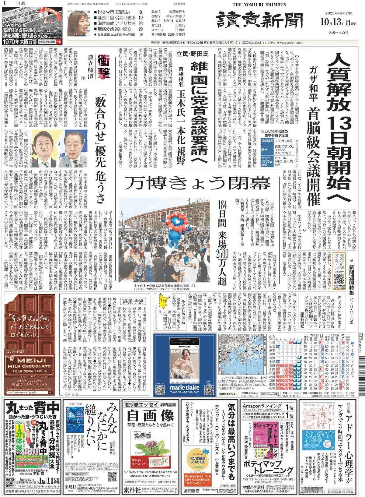 《读卖新闻》头版称,埃及总统府11日宣布,巴勒斯坦加沙自治区和平首脑会议将于13日在埃及东部沙姆沙伊赫举行。 总统阿卜杜勒法塔赫·塞西和美国总统特朗普将担任联合主席。 以色列与伊斯兰组织哈马斯达成的和平计划“第一阶段”规定的所有人质的释放预计将于当地时间13日上午开始。 总统府在一份声明中强调了这次会议的目的,称“我们将结束加沙战争,继续为中东地区的和平与稳定而努力,并将地区安全提升到一个新的水平。 会议邀请了20多个国家参加,根据各国报道,斡旋和谈的英国、法国、意大利、土耳其、卡塔尔等国都计划参加。 据以色列报纸《Hayom》报道,以色列不会参加。 据埃及外交部称,会议还计划签署一份呼吁结束加沙战斗的文件,旨在在各国的支持下实现永久停火。 另一方面,关于释放所有人质的日期和时间,哈马斯官员奥萨马·哈姆丹11日告诉法新社,“将于13日(当地时间)上午开始”。 以色列总理府发言人也表示,释放时间为12日“13日凌晨”。 加沙仍有 48 名人质,其中约 20 人据信还活着。 根据协议,以色列还将释放约2000名巴勒斯坦囚犯。 据埃及国家电视台报道,约400辆卡车将于12日进入加沙,扩大向加沙运送援助物资。