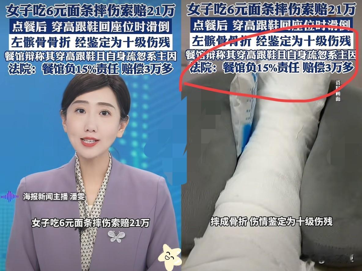 岳阳一女子在某餐馆点了一份六元的面条。在返回座位时不慎摔倒。后被鉴定为十级伤残。于是,女子起诉餐馆,要求赔偿21万元! 自己穿高跟鞋、又是常来的老餐馆,没证据说地面有油或者有坑,就硬说人家有安全隐患? 照这逻辑,走大街上摔了,是不是还得告市政部门?法院判餐馆担15%责任,赔偿女子三万多元。可“安全隐患”的实锤在哪? 没说清楚就让店家掏钱,这不跟让小老板平白吃个哑巴亏一样吗? 现在开个小餐馆多难啊,起早贪黑赚点辛苦钱,遇上这种事可能大半年都白干! 判罚得讲证据、凭良心,不能光看谁受伤就往谁那边偏,不然以后谁还敢踏实做生意? 法院的判决,逻辑不成立,太不严谨了吧?