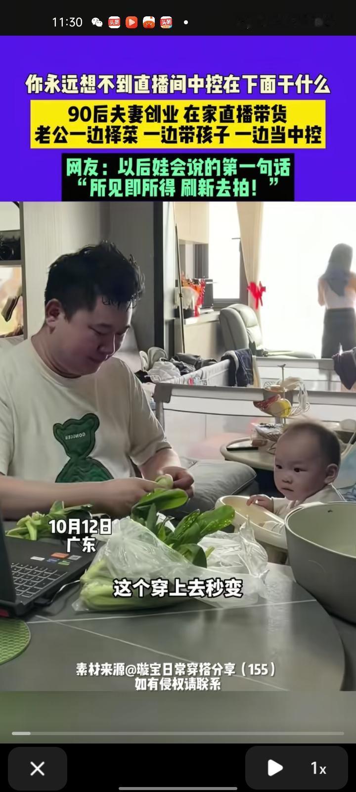 10月12日,广东中山。你永远想不到直播间中控下面在干什么,90后夫妻创业,妻子在家直播带货,而老公一边择菜一边带孩子,还一边当中控“所见即所得,刷新去拍”。宝宝听到后觉得“这两老登在跟谁说话呢”,还有网友称,原来男人可以干很多事。