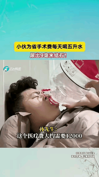 “这是个狠人!”男子被查出左肾有一个结石,手术的话需要12000元的费用。男子觉得不痛不痒的花那么多钱太贵了,于是就打算多喝水,让它自己排出来! 从那天开始,男子每天都喝5升的水,还坚持运动,就这样持续了一两个月,还真成功了,他排出来一个9毫米的结石,整个人都轻松了! 不得不说这男子是个狠人啊,先不说其他,结石掉下来的时候好像很疼吧,我见过我舅舅的样子,一个四十多岁的男人,疼的躺在床上动不了,一身的冷汗,主要是很折磨人! 他这个这么大,能拍出来真是厉害了,不是说尿道细的地方才2毫米吗?他都不怕把尿道割破了! 不过现在结石都是用震的,费用要这么多吗? 他能自己排出来也确实省了不少钱,但这个好像会反复是吗? (视频来源:法治频道,侵删[祈祷])