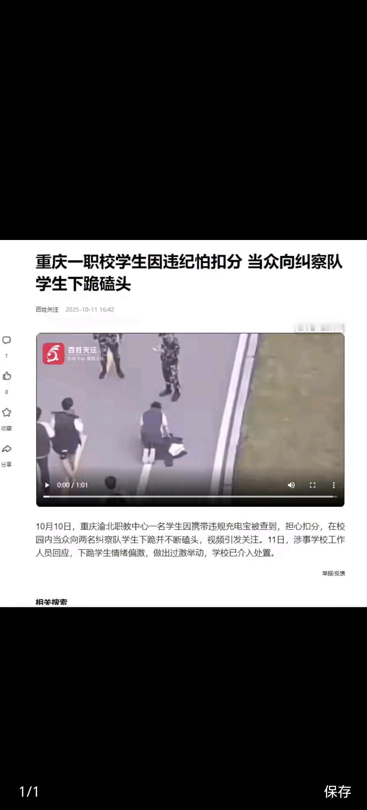 重庆某职教中心一学生因携带充电宝,竟当众向纠察队下跪磕头,校方回应却称是“学生情绪偏激”。如此解释,令人难以接受。 扣分制本为管理,如今却异化为“校园PUA”。当扣分与评优、毕业捆绑,学生寸步难行,甚至被逼至下跪——这早已偏离教育初衷。 校方将问题归咎于学生“情绪偏激”,实为推卸责任。若非校规严苛至此,何至于此?教育若只讲规定、不顾尊严,与驯化何异? 更令人心寒的是,现场纠察队员冷眼旁观同学下跪。当管理演变为权力游戏,学生学会的不是规则,而是屈从。 今天能为充电宝下跪,明天就会为毕业证屈膝。教育若连尊严都可践踏,又何谈育人? 我们究竟在培养什么样的下一代?