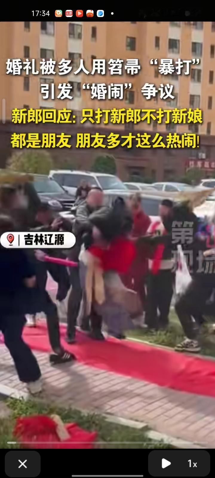 10月13日,吉林辽源。婚礼现场中,新郎被十多位朋友拿笤帚“暴打”,红地毯被踩的乱七八糟,别人接亲是浪漫温馨,他们接亲直接上演笤帚大战。新郎沈先生回应称,这帮朋友和自己的年纪差不多,20多岁,也为了好玩、热闹。在东北,朋友多才能达到热闹这种程度