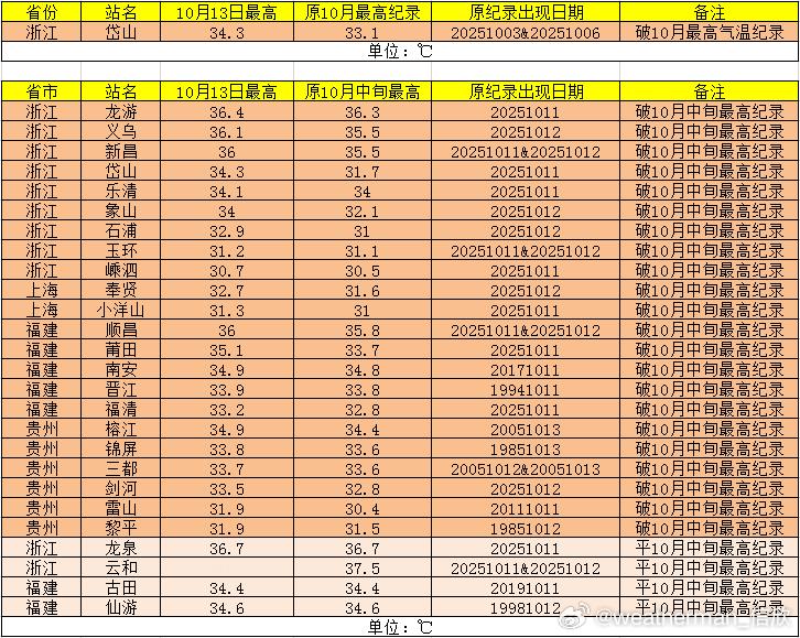 今天15个气象站气温打破10月中旬最高纪录,这其中浙江岱山34.3℃也打破10月最高气温纪录;浙江义乌、象山、石浦、上海奉贤、贵州剑河,连续3天破10月中旬纪录;福建莆田也打破最晚高温日纪录。此外福州也打破最晚高温日纪录。