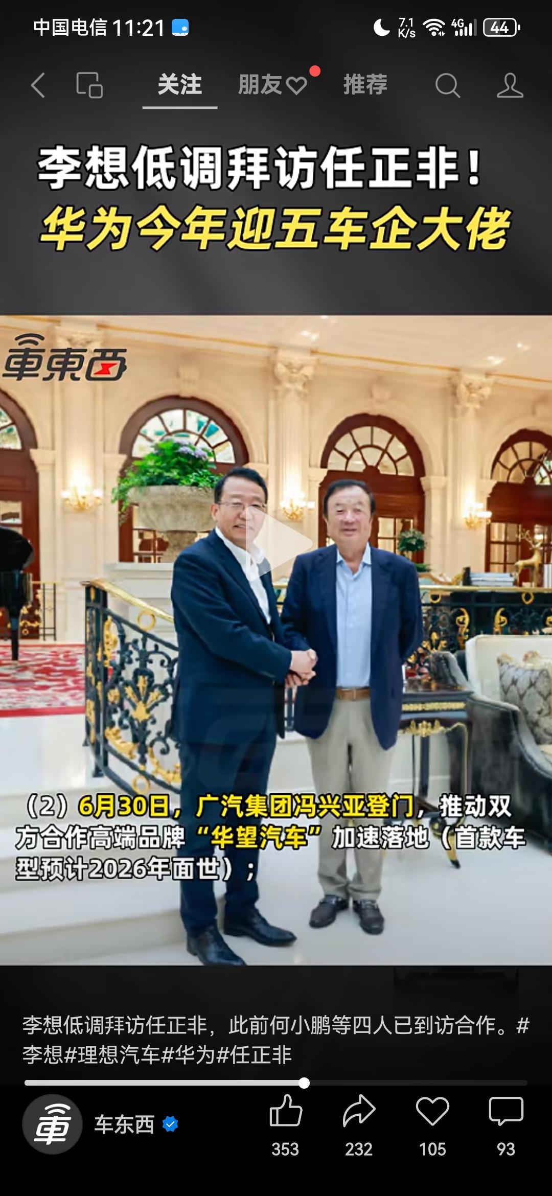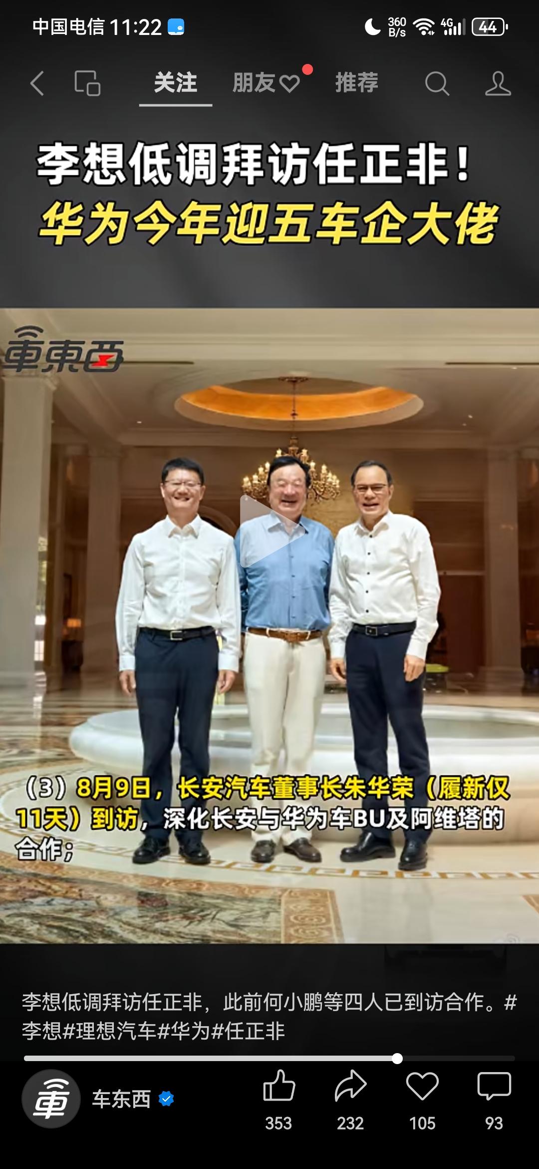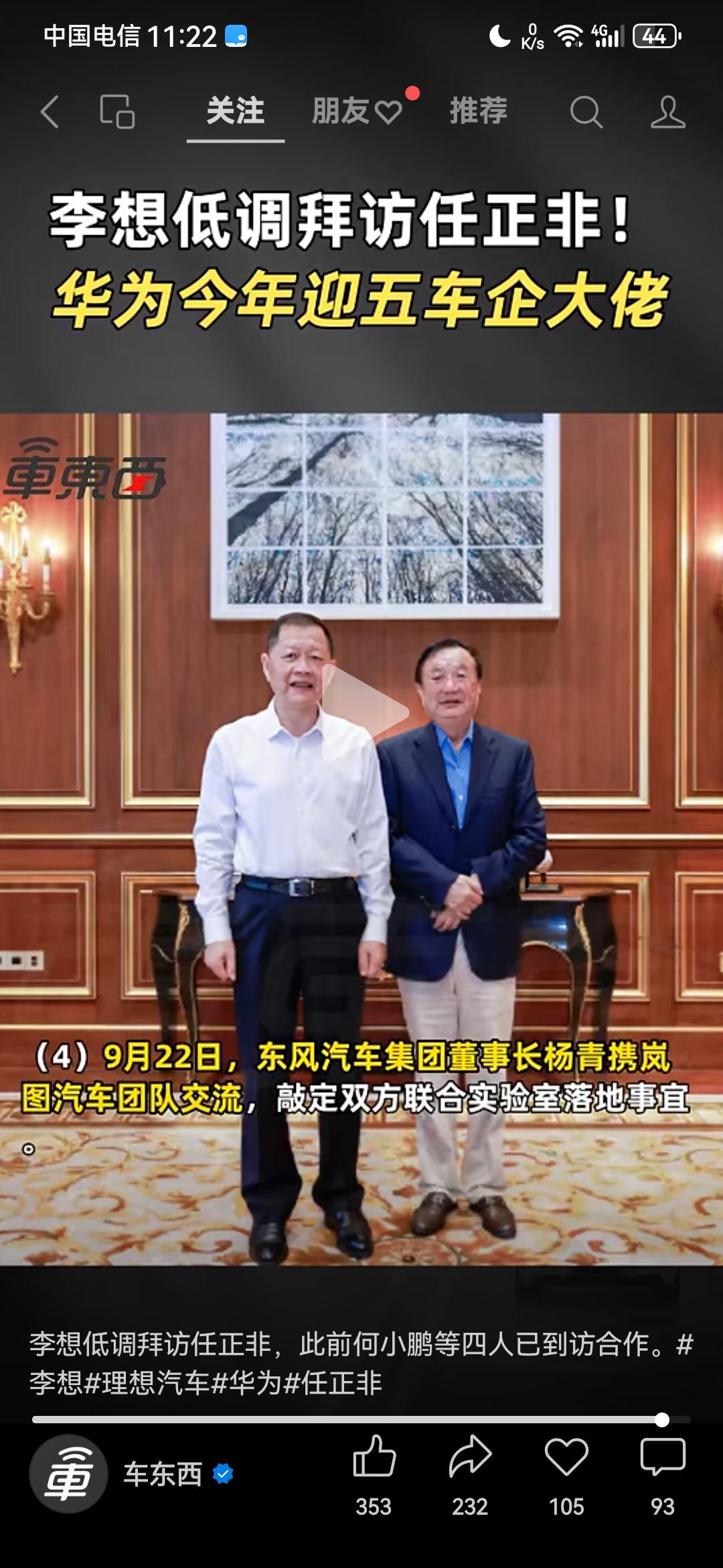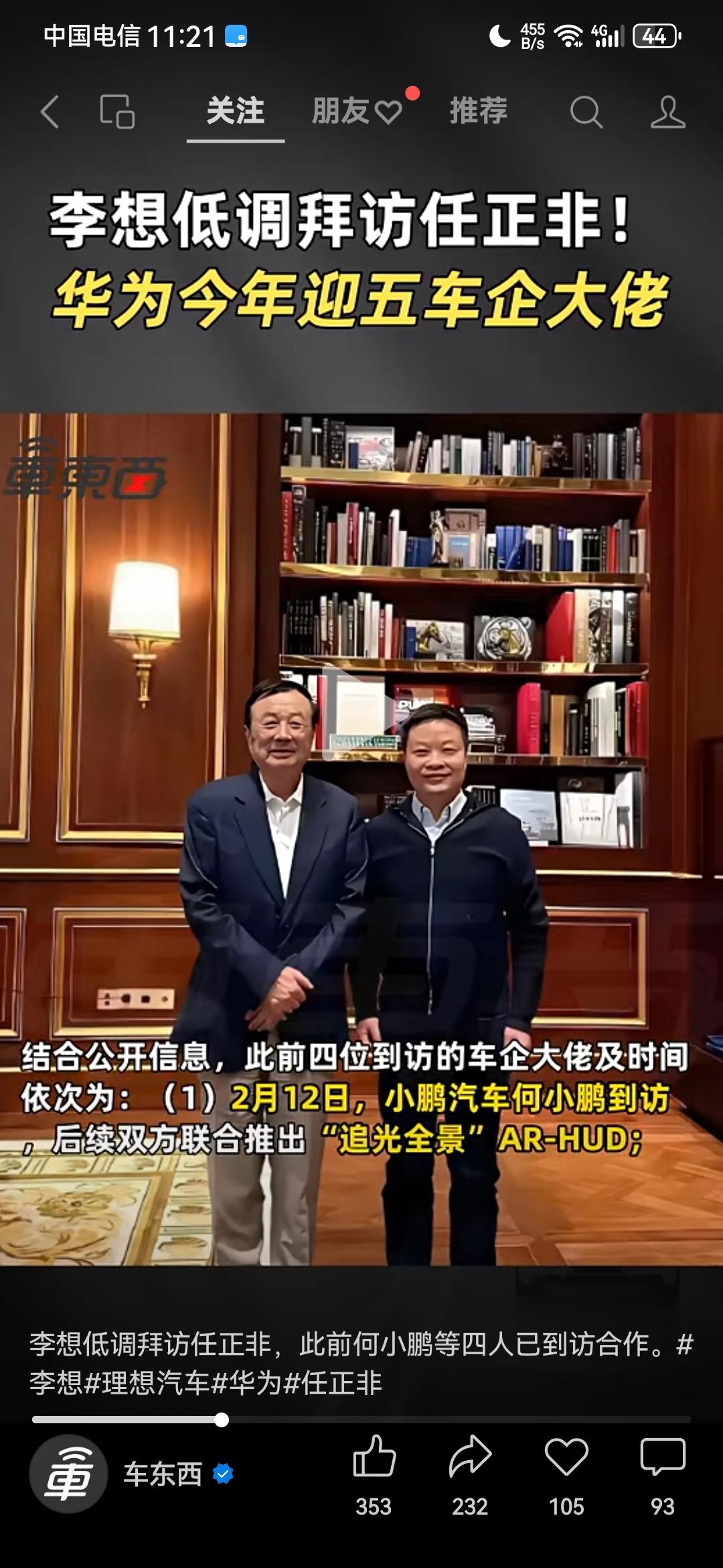 车圈大新闻!根据车西西10月13日报道,理想汽车创始人李想,近日竟然前往华为总部,拜访了任正非,这是今年以来,第五位前往华为拜访任正非的车企大佬! 在这之前,拜访任总的则分别是小鹏汽车创始人何小鹏、广汽集团冯兴亚、长安汽车董事长朱华荣、东风汽车集团董事长杨青。 与此同时,拜访任总之后,这些车企大佬,更是都纷纷跟华为签了合同,开发了重磅的合作项目,比如小鹏汽车就与华为联手推出了“追光全景”AR-HUD。 汽车工业号称是“工业之王”,技术含量极高,只要上了一点规模的车企,都是当之无愧的巨无霸,以其为核心的上下游产业链,动辄就能提供数十上百万的就业,可是现在这样的车企,竟然纷纷集体拜访任总,不得不说是一个奇观。 之所以如此,主要还是任总创办的华为,太值得学习! 华为虽然没有亲自下场造成,但是通过与塞力斯等企业合作,开发出的问界、智界、享界、尊界等车型,都取得了巨大成功。 这当中体现出的,华为对于车企的赋能,足以让任何一个人都为之震撼,原本那些平平无奇的车企,经过华为一番改造之后,立刻焕然一新,宛若重生,爆发出惊人的力量。 华为与其他车企合作之初,还有很大争议,甚至有车企负责人直接放言,非常激烈地说:“跟华为合作,就是丢掉了灵魂!” 但随后的成果证明,这所有争议都是浮云,成绩才是实打实的,跟华为合作,就是能够浴火重生! 华为在这里,简直就好像是车企的“黄埔军校”,经过华为的一番培育赋能,立刻就能蜕变重生。 在这样的情况下,其他车企自然都能想得清清楚楚,如果想要自己变得更强,那么就应该向华为学习,因此,李想等车企负责人,接连拜访任总,自然是顺理成章的事情。 写到这里,不由得感慨,华为的伟大,现在已经丝毫不用怀疑,即便是在美国的打压之下,依旧能够涅槃重生,自研芯片、自研手机操作系统,各方面的技术,震撼整个世界。 但,很多人都只看到了华为的强大,却没有看到华为给我们带来的,更加深远的一个意义。 那就是,现在的华为,已经成为了一个榜样,越来越多的中国企业,都开始学习华为,而华为也毫不吝啬,将自己的一切经验,都毫不保留的传授给了愿意学习他们的企业。 这样一来,最后的结果就是,华为一家企业,带着中国其他无数企业,实现了根本的蜕变,完成了组织力的升级,变得更加具有战斗力,更加具有创新力。 任总在这里,已经不是简简单单的华为创始人那么简单了。 他更是整个中国工业的“教父”!给所有后继者,指明了一条能够通向成功的通天大道!