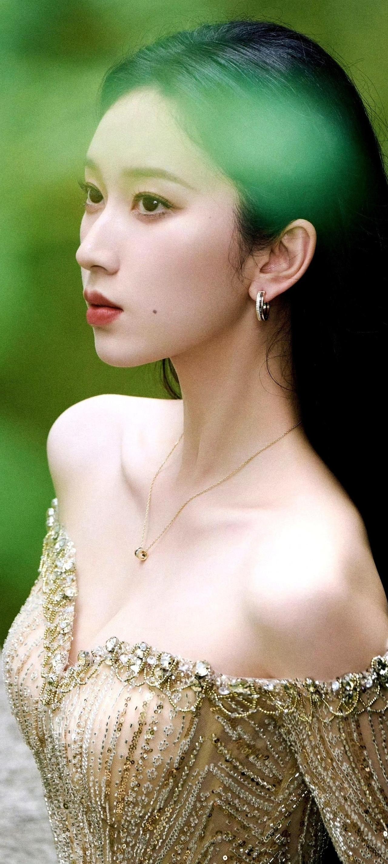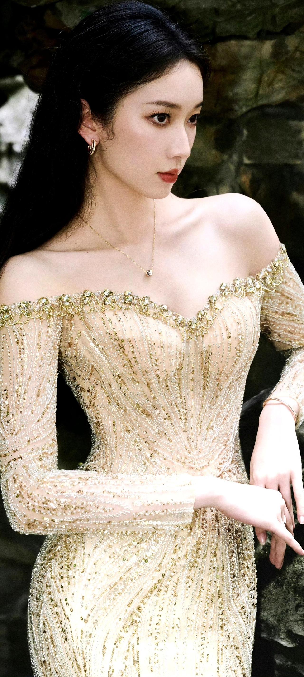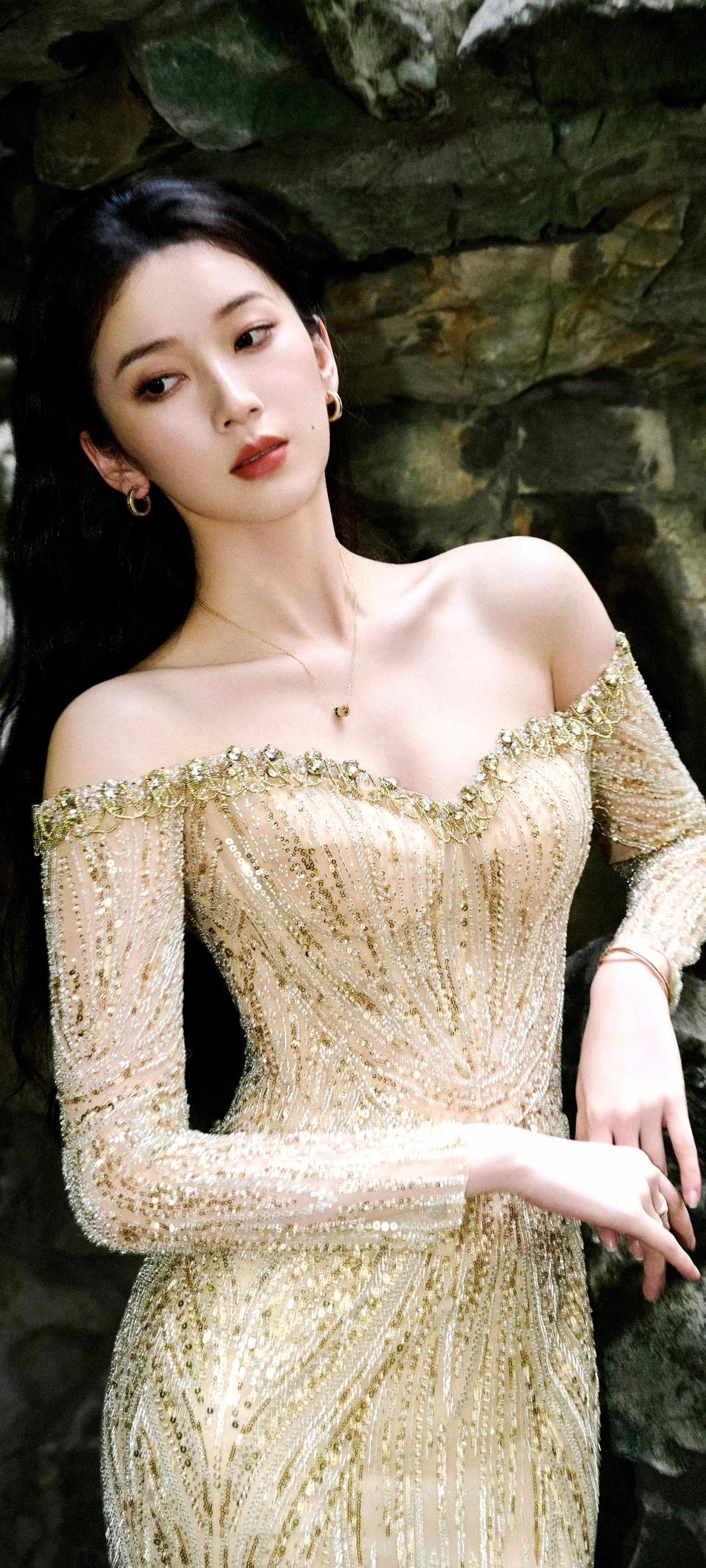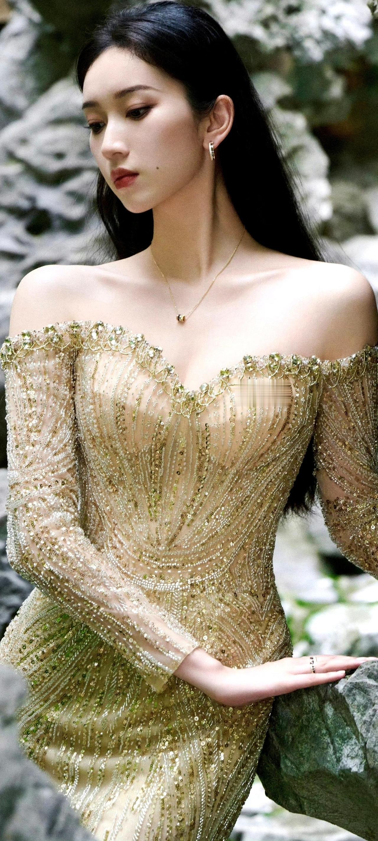 刘令姿,优雅黑发美人,金色长裙在石壁前闪耀,气质非凡!👗✨💃女明星谁最美?