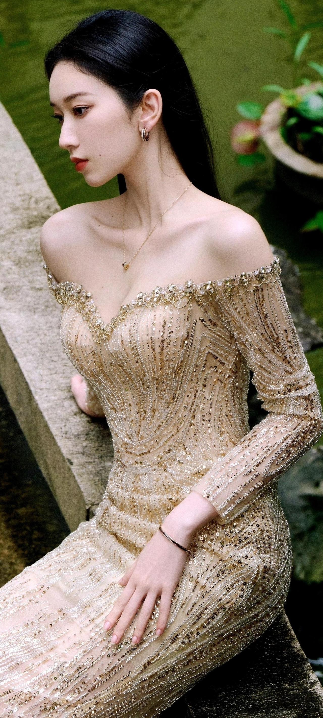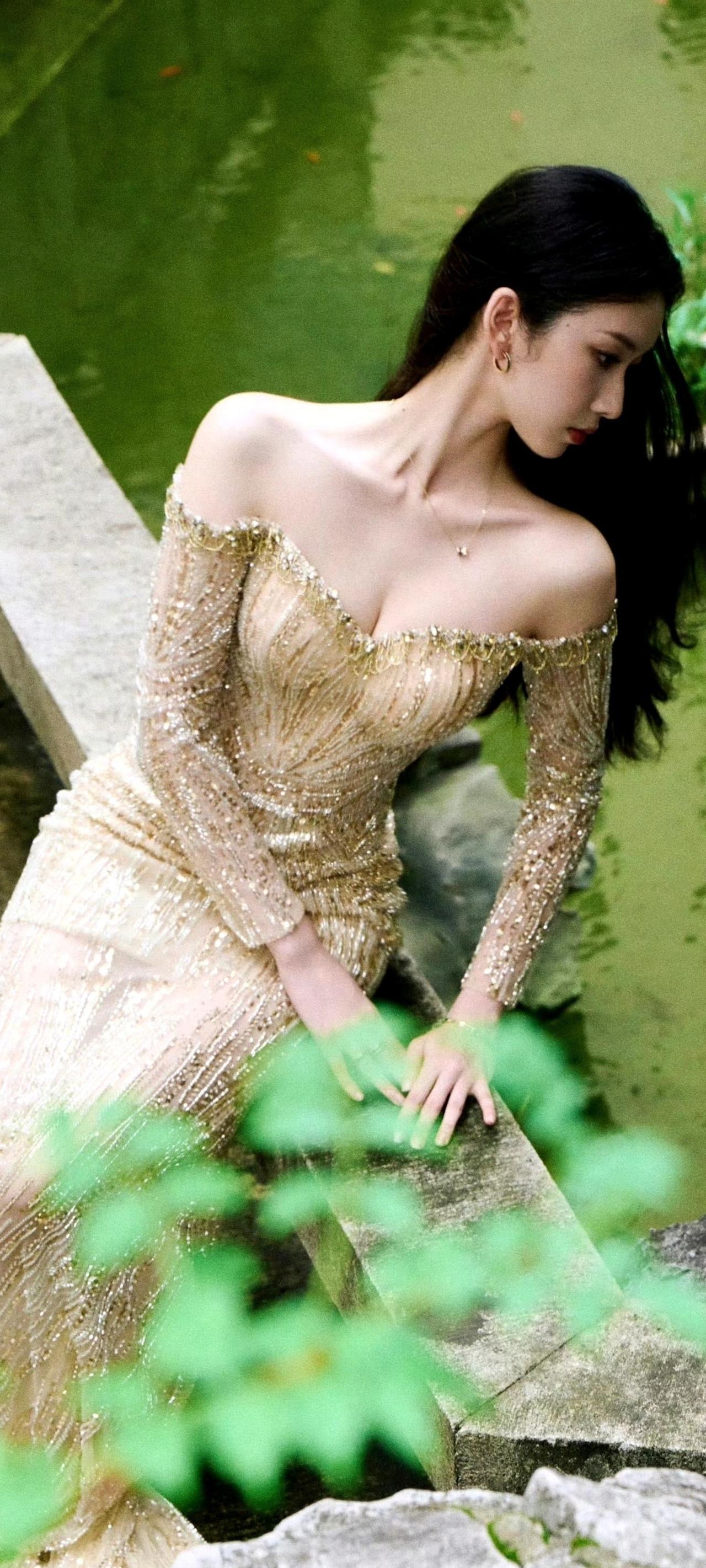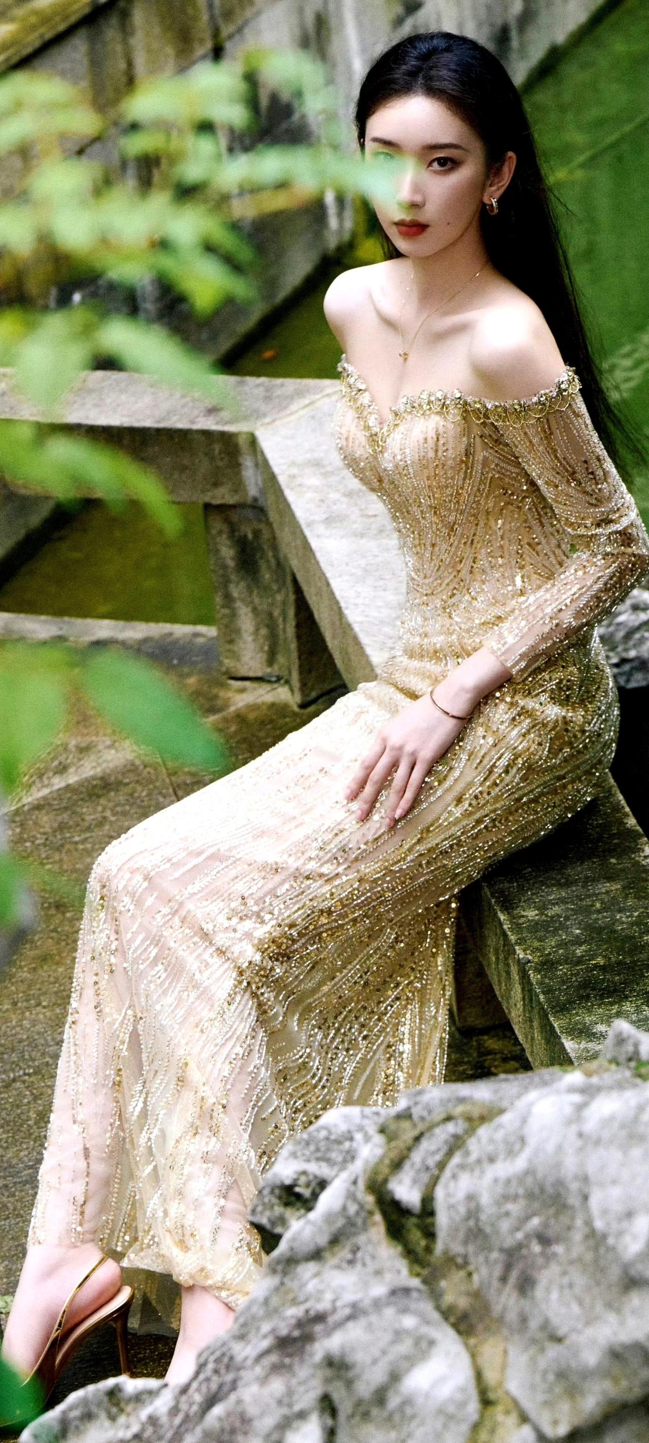 刘令姿,优雅黑发美人,金色长裙在石壁前闪耀,气质非凡!👗✨💃 女明星谁最美? 哪位女明星最迷人