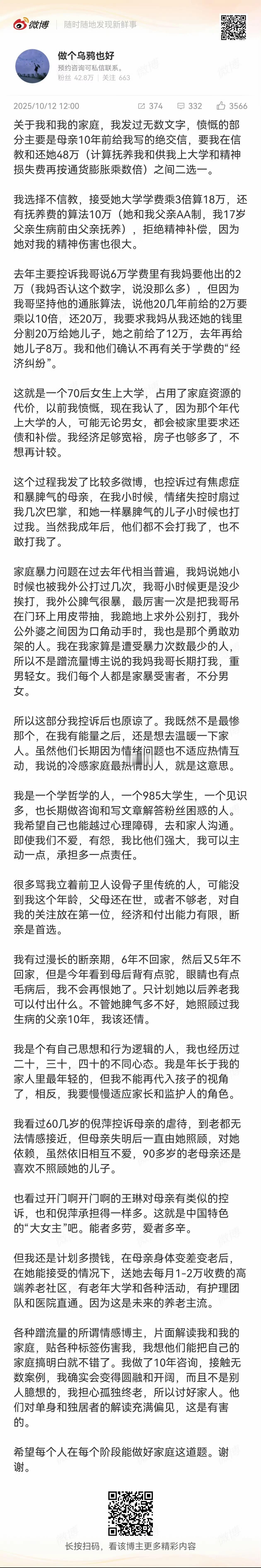 10月12日,“初代网红”、著名美女作家木子美发了一篇长文,罕见谈到了自己的原生家庭,说现在已经与原生家庭和解,“有能量之后,还是想去温暖一下家人”。 木子美的原生家庭并不圆满,比如说在她母亲就挺重男轻女,仅仅因为一些口角矛盾,在高考前一天,竟然就能将她锁在了卫生间整整一夜。 木子美提到,在年轻的时候,她性格尖锐,对母亲并不理解,甚至还带着怨恨,双方的矛盾,在她母亲给她写了一封绝交信之后,达到了巅峰,木子美在那之后,给了母亲48万块钱,就与其断了联系。 但她现在渐渐想通了,这或许并不是她母亲的问题,而是时代的问题,毕竟她所在的年代,不像现在,大部分都穷,要上大学,家庭需要挤出很大一部分资源,而一个很穷的家庭,挤出一大部分资源,供养一个大学生,生活肯定要受到很大影响。 她的家庭在她上大学这一方面,不仅没有阻拦,还提供了学费,这个已经是相当不错的了,就算是要求她还债和补偿,也算是合情合理。 木子美还提到,她对母亲另外一点的怨恨,就是母亲的一些暴脾气。 但是这个,她现在也渐渐想通了,毕竟那个年代,很多家庭就是那样,打孩子是司空见惯的事情,甚至她还算是被打得少的。 木子美提及她哥哥,当年挨过的打更多,她外公甚至曾把他哥吊在门环上用皮带抽。 这些问题,都是当年那个穷困年代许多家庭普遍面临的共同问题,她在其中其实还算是比较幸运的一份子,毕竟她能够上大学,且还学有所成。 想通了这些,木子美对于她的家人,现在再也没有以前那么多的不愤了,她诚恳写道:“我有过漫长的断亲期,6年不回家,然后又5年不回家,但是今年看到母亲后背有点驼,眼睛也有点毛病后,我不会再恨她了,只计划她以后养老我可以付出什么。” 木子美的文笔还是挺不错的,整篇文章写的也很诚恳,让人看了心中生出许多感慨,家庭之间的羁绊,纷繁复杂,很难用言语说清,只能是如人饮水,冷暖自知了。