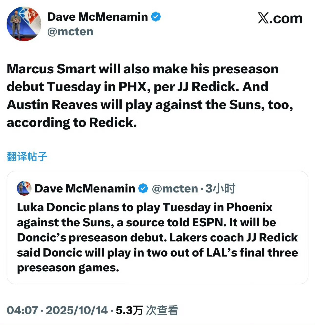 ESPN:东契奇计划出战周三对阵太阳的季前赛,最后三场季前赛他可能会打两场。斯玛特将在周三迎来自己季前赛首秀。昨天险些受伤的里夫斯也会出战。
