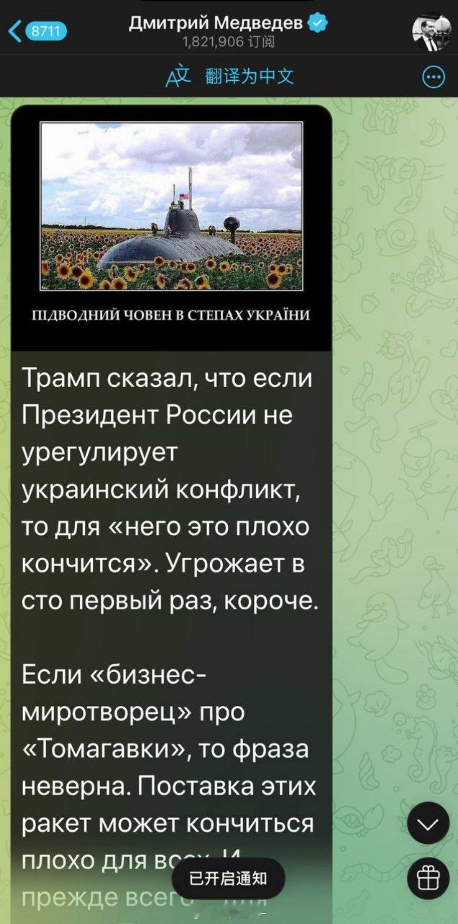 ➖“已经用连星条旗叔叔都能懂的方式说过一百次了,在飞行中,无法区分‘战斧’导弹配置的是核弹头还是常规弹头。而且发射它们的不是基辅,而是美国。换句话说:是特朗普。那么俄罗斯该如何回应呢?就这个意思!”——安全委员会副主席写道。
