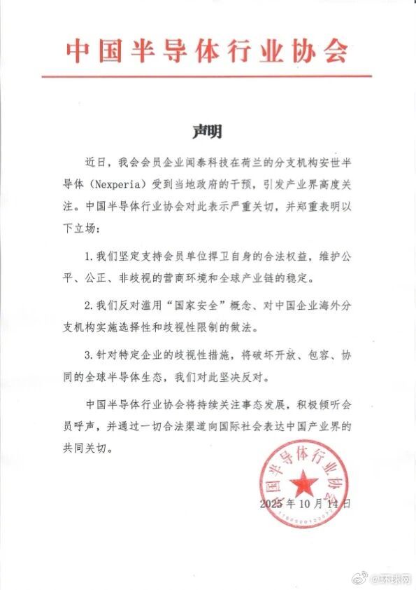 #中国半导体行业协会郑重表明立场# #中国半导体行业协会声明#【闻泰科技在荷兰分支机构安世半导体受到当地政府干预,中国半导体行业协会:严重关切】#中国半导体行业协会严重关切荷兰干预闻泰科技# 近日,我会会员企业闻泰科技在荷兰的分支机构安世半导体(Nexperia)受到当地政府的干预,引发产业界高度关注。中国半导体行业协会对此表示严重关切,并郑重表明以下立场: