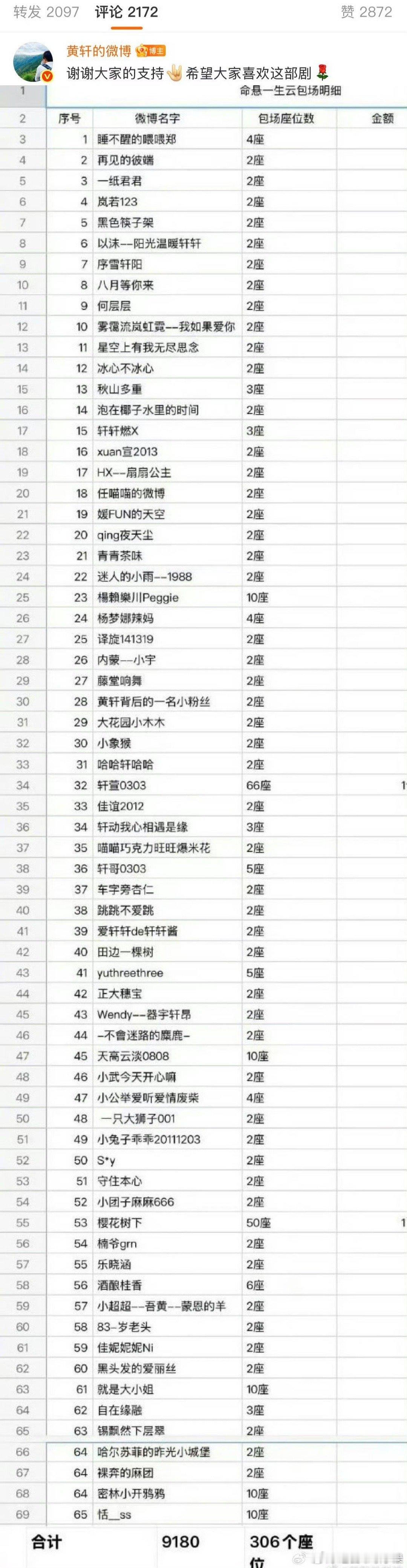 我去 黄轩拉了一张表 感谢了云包场的粉丝 ​​​