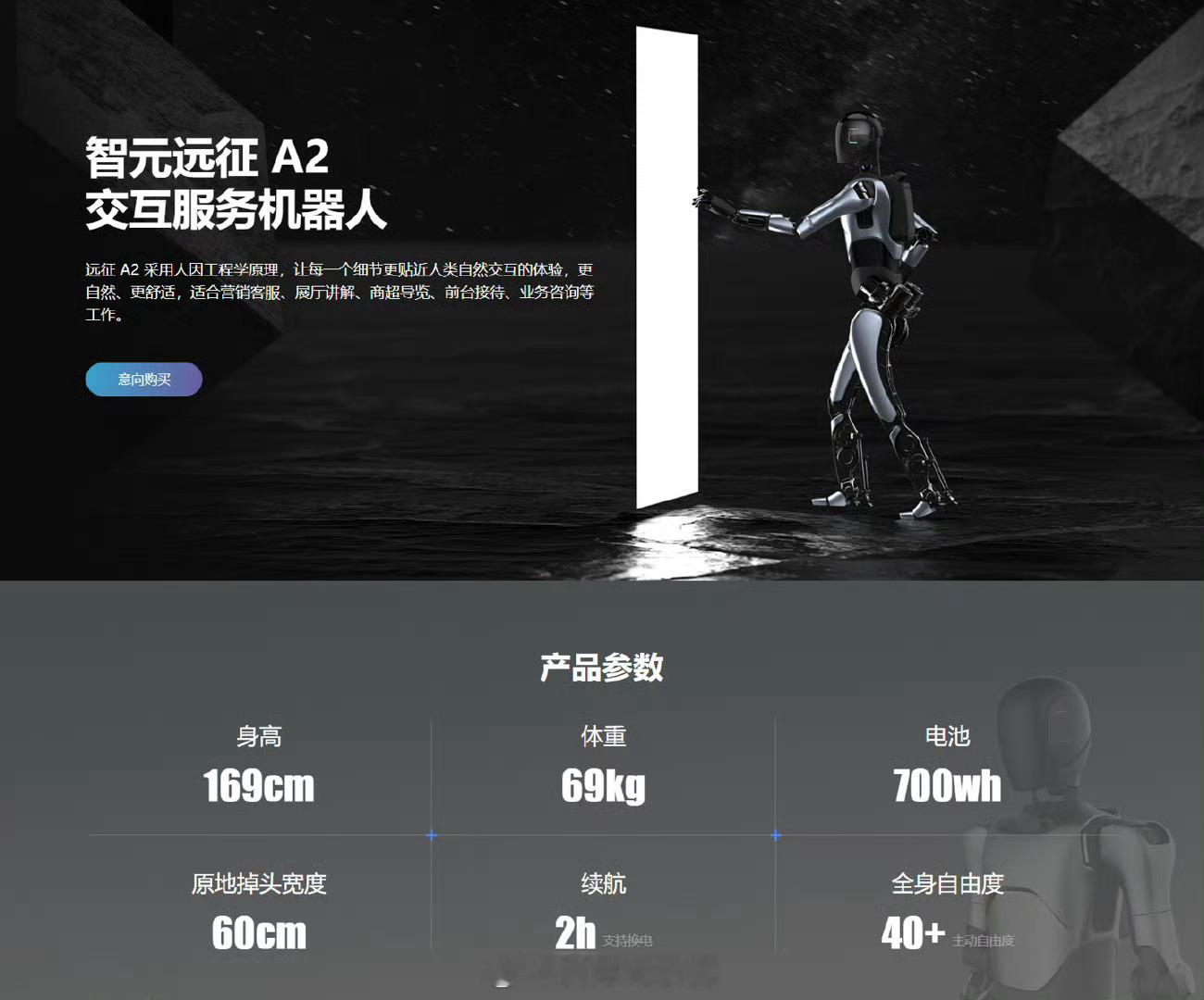 智元远征 A2 于去年 8 月 18 日发布,为交互服务场景量身定制,身高 169cm,重约 69kg,内置 700Wh 电池,原地掉头宽度 60cm,续航约 2 小时,全身自由度 40+。