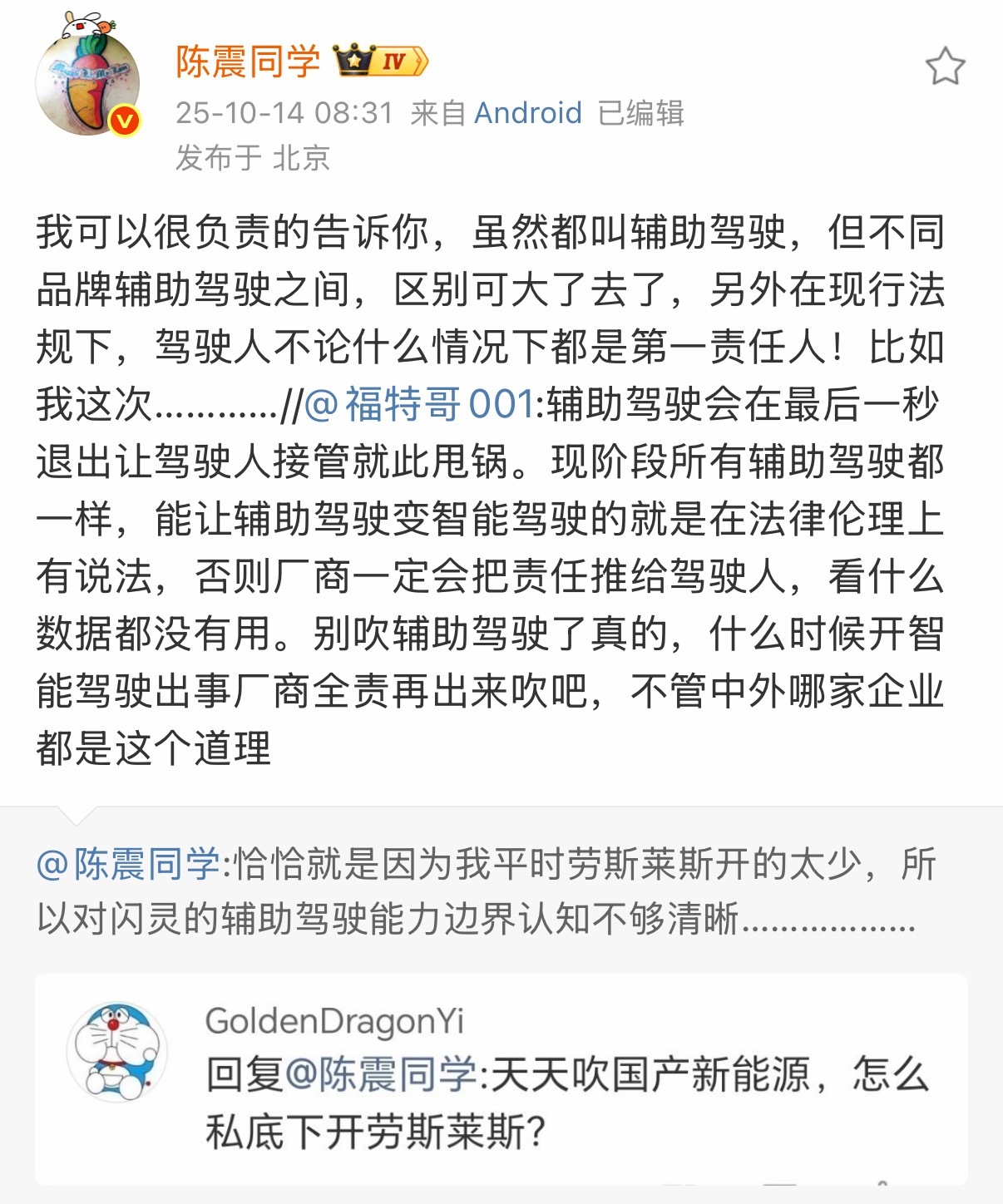 陈震疑似回应上次劳斯莱斯闪灵车祸事件:用了辅助驾驶,在最后一秒退出让驾驶人接管就此甩锅。对比,你怎么看?