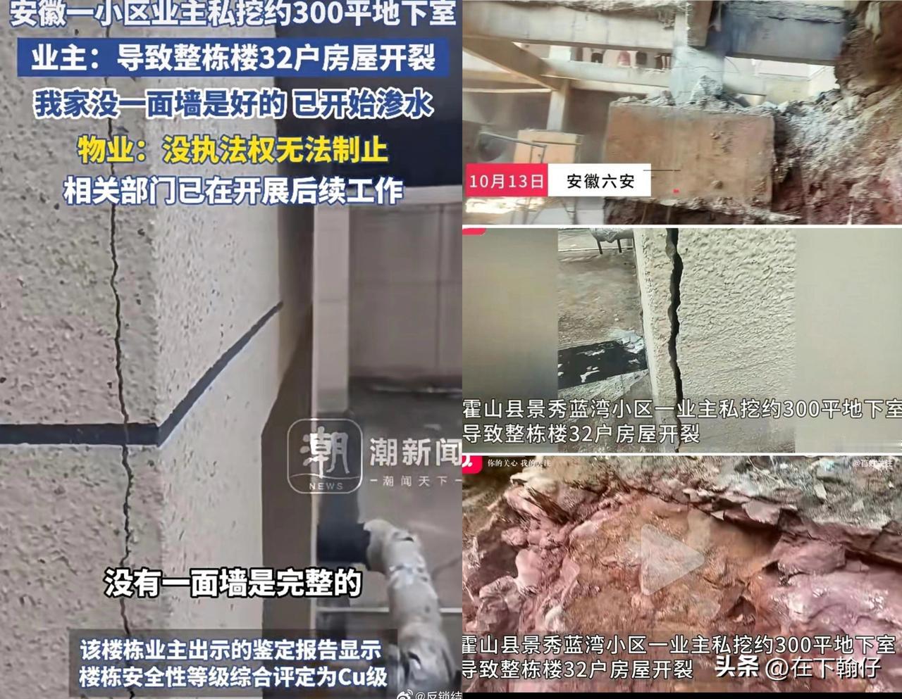 “楼下挖出300平‘总统套房’,楼上32户全体变危房!”业主私挖地下室致整楼开裂,警方立案。 近日,安徽省六安市霍山县景秀蓝湾小区发生一起令人震惊的违法建设事件。一名黄姓业主在未取得任何审批手续的情况下,竟私自在家中开挖约300平方米、深达3-4米的地下室,导致整栋9层住宅楼结构受损,安全性被鉴定为Cu级(局部危险状态),32户居民被迫生活在危险之中。目前,霍山县城管、住建等部门已联合立案调查。 挖机进小区,能挖出这么大这么深,肯定不是小工程。居民多次投诉,但初期未得到有效制止。楼下挖出个300平总统套房,楼上全体变成危房。 业主为了扩大自家使用面积,不惜赌上整栋楼的安全,这已经不是简单的“无知”,而是对他人生命财产安全极度冷漠的“无畏”。他不会认为只要做得隐蔽就能蒙混过关吧? 施工的也胆大,什么钱都敢赚,白天挖晚上运…这操作也太离谱了!简直是损人不利己,自己家也得担风险,这到底是无知还是胆子太大?为了自己的一己私利做出这种事,这也太吓人了 。