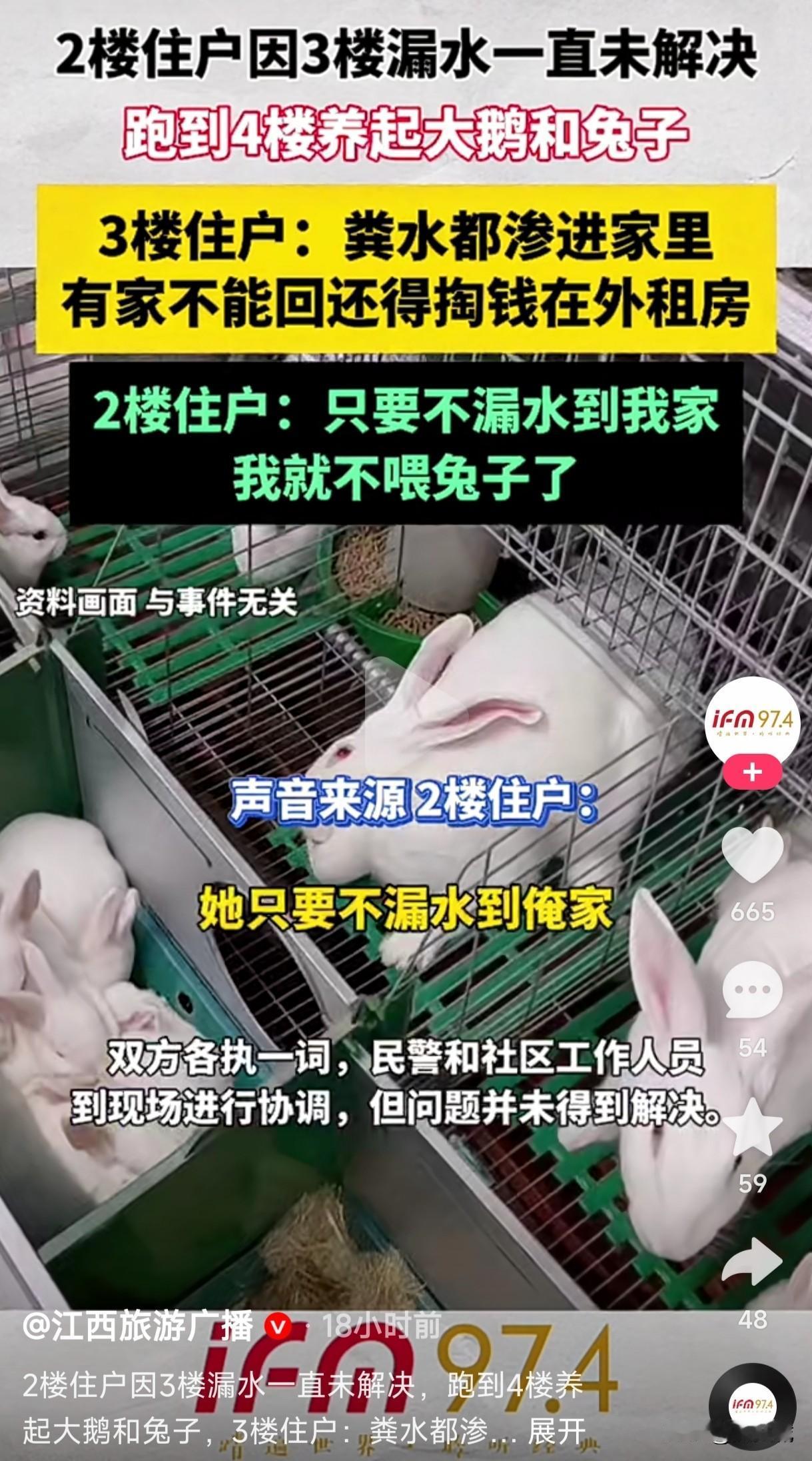 有钱人就是任性,农村人盖大棚搞养殖,而城里人买楼房搞养殖,2楼住户在4楼养起大鹅和兔子,不仅扰民而且粪水还渗进3楼家里。 河南许昌的黄女士向媒体反映,她住在3楼,2楼的邻居在4楼养大鹅和兔子,不仅扰民而且粪水还渗进了她的家里,害的她有家不能回,有房子不能住,而且还要在外面租房子住,并且这种情况已经持续好几年了,找2楼邻居多次没有得到任何解决,2楼的邻居甚至说,只要粪水不流到他家,他是一直会养大鹅兔子的。 遇到这种泼皮无赖,民警和社区工作人员到现场进行调解,但问题也未能得到解决,这种邻居谁遇到估计都没有办法,简直是从天灵盖侮辱到脚底了,这样的邻居该用什么办法来治治他呢?