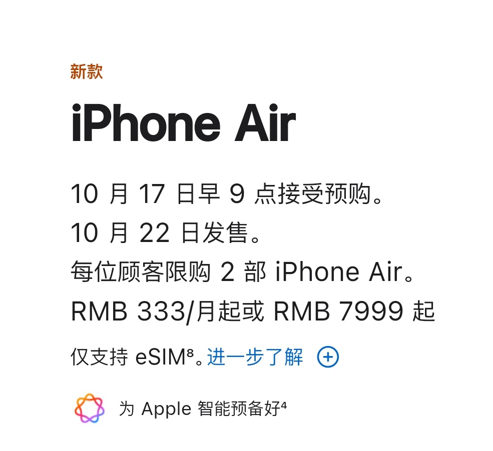 苹果官网显示,iPhone Air将于10月17日接受预购,10月22日发售。所以esim的政策问题,是已经解决了?