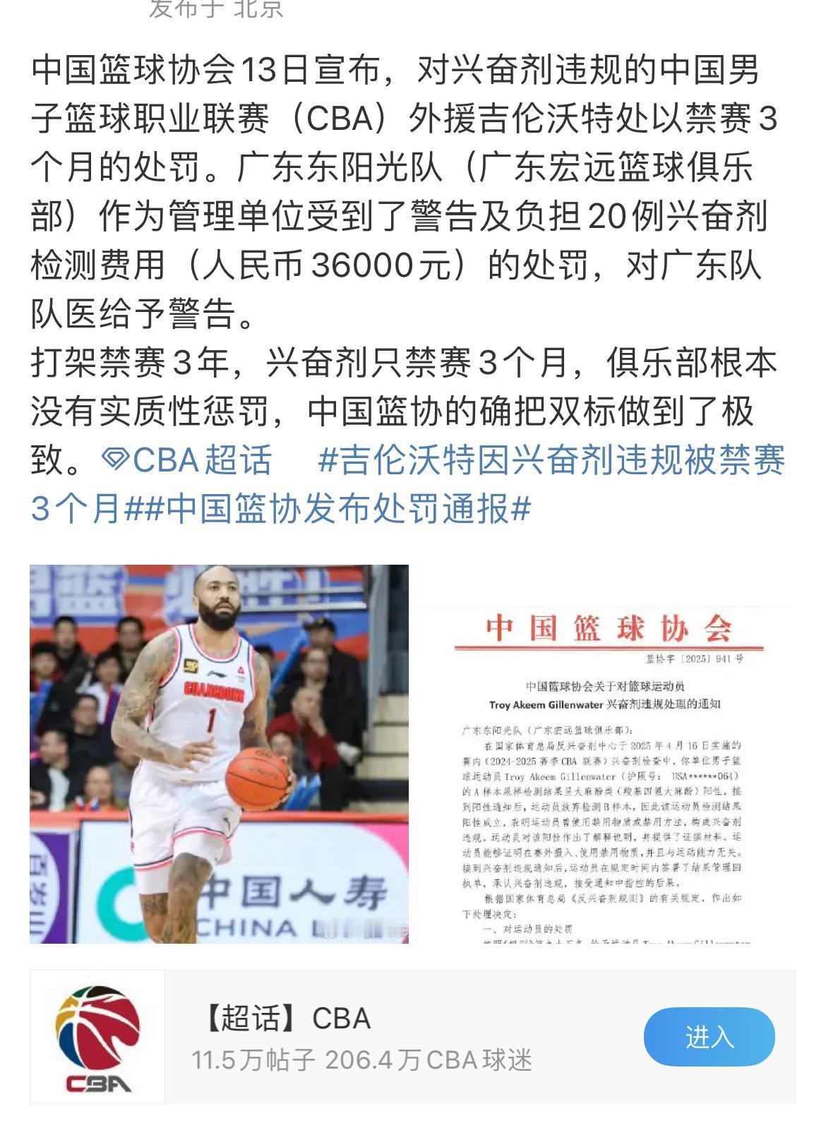 广东男篮亏大了!昨天晚上,CBA联赛宣布吉伦沃特已被禁赛3个月!同时给予广东男