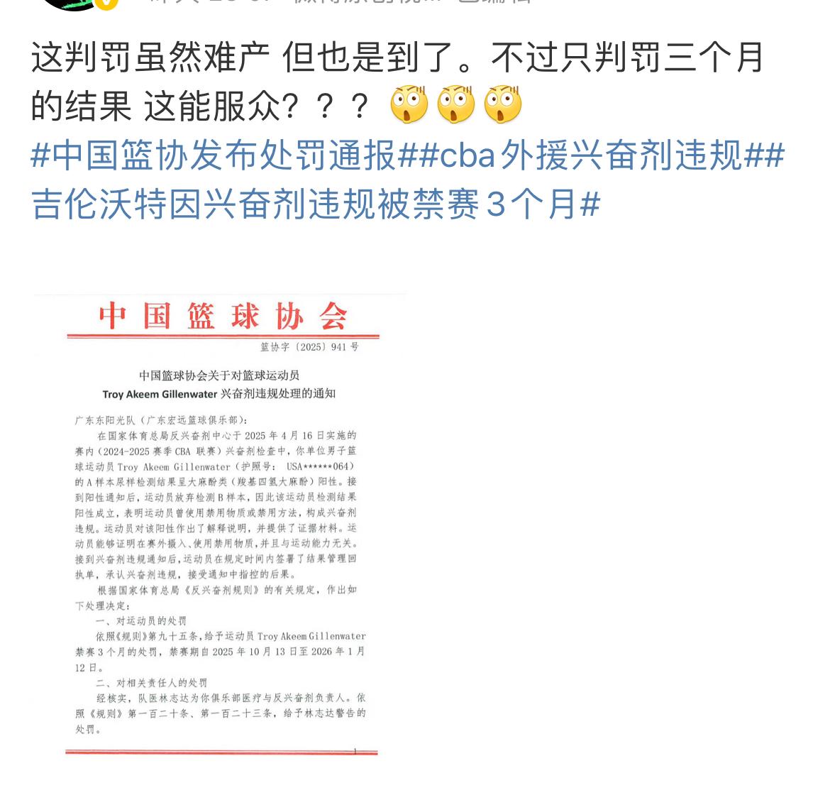 你看你们又急了,篮协不处罚吧,你们整天的哭着喊着催促着要篮协抓紧处罚,这边篮协刚发文处罚了吧,那边你们又不满意,到底要让篮协该怎么做呢? 广东宏远球迷不惯着球员,不管是国内球员还是外援,任何球员只要违反了相关的法律法规以及赛场纪律,篮协该怎么处罚就怎么处罚,球迷们也绝不护短,就是要让球员长长记性,错了就要任罚,挨打就要立正,这没什么说的!功是功过是过,上赛季吉吉作为一名老将在球场上兢兢业业为广东队效力,广东球迷支持他,但是他使用禁用物质构成兴奋剂违规从而受到篮协惩罚,广东球迷支持篮协的处罚,这没毛病。至于有些球迷总是拿不一样性质的事情来做比较,那能比吗?都不是一码子事。