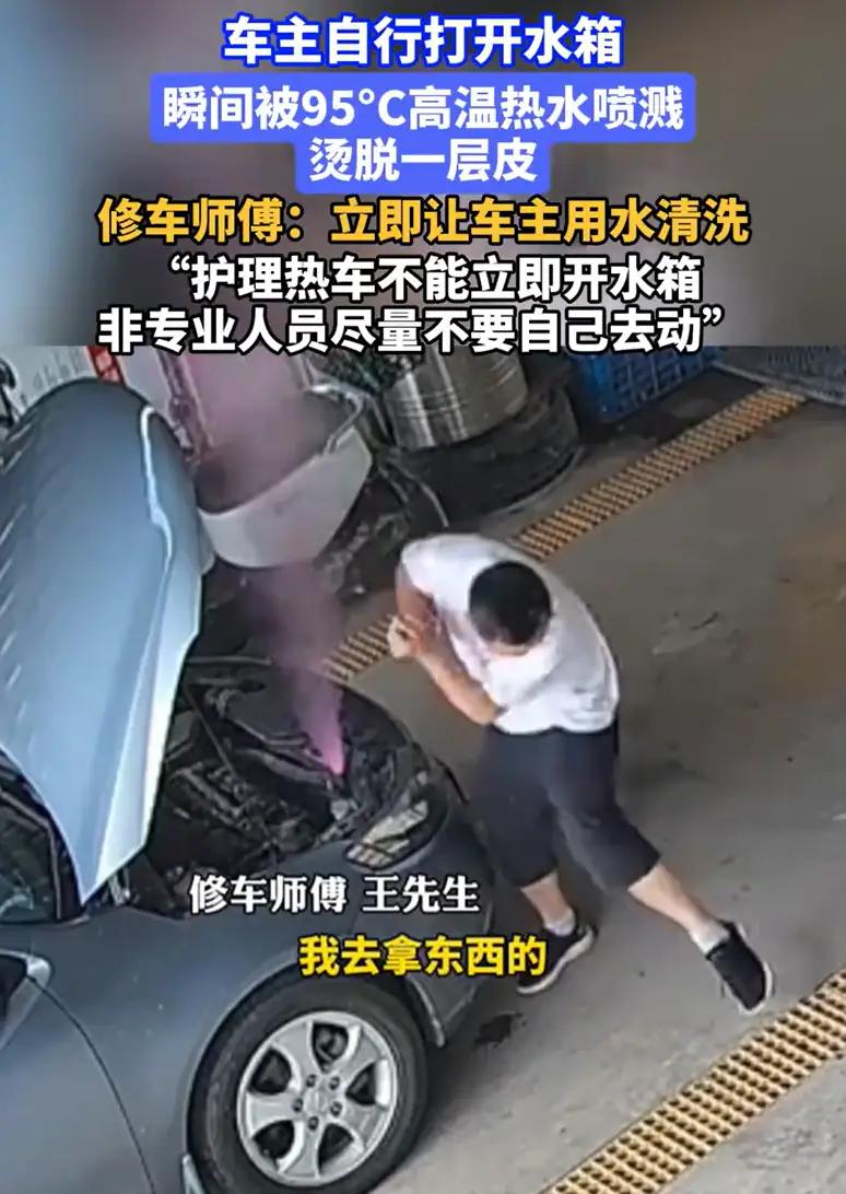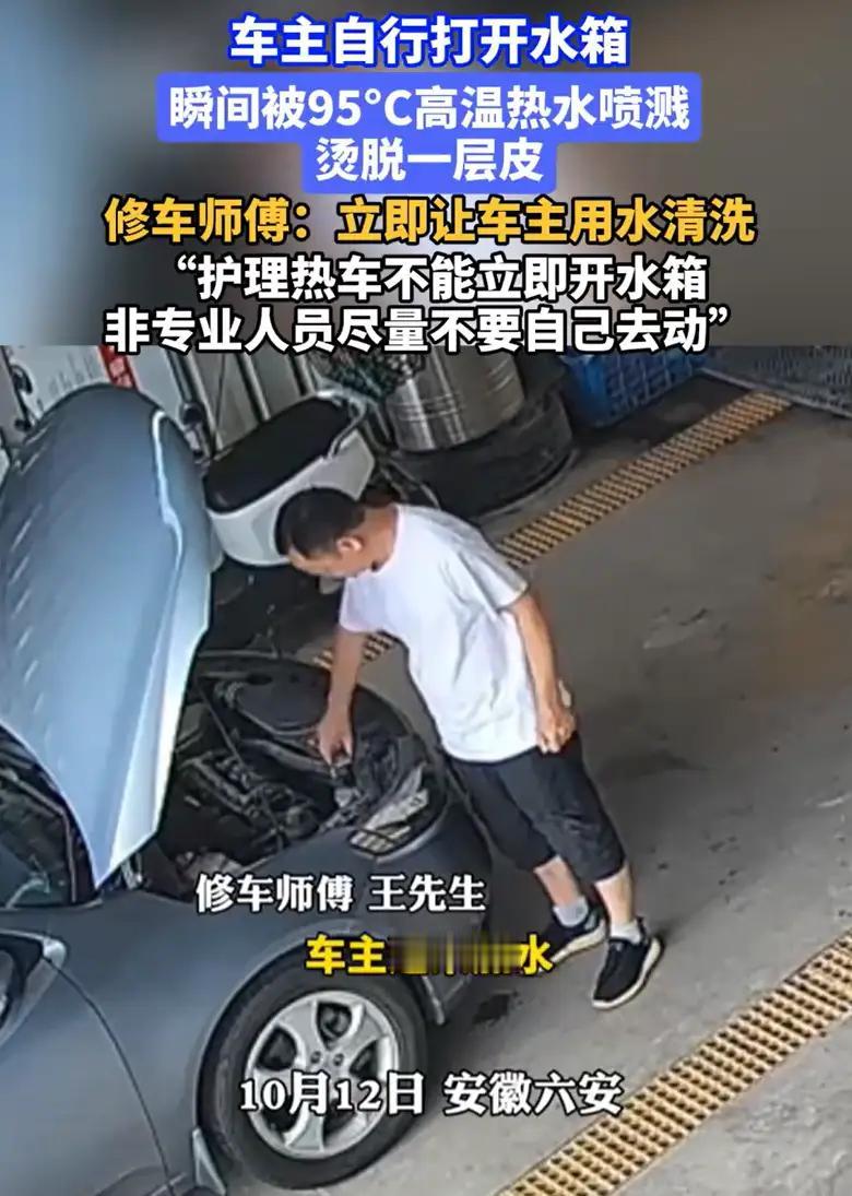 安徽六安,一男子开车到修车店加水,闲暇之余,就自行打开车子的水箱,结果瞬间被95°C高温热水喷溅烫脱一层皮!网友:不懂还自以为是! 据现场目击者介绍,该男子驾车前往修车店,原本只是想添加冷却水。在等待期间,他心生好奇,未咨询维修人员,也未采取任何防护措施,擅自伸手去打开水箱盖。就在盖子被掀开的瞬间,水箱内温度高达95℃的热水和蒸汽突然喷涌而出,直接喷溅在男子的手臂上。 男子当即发出惨叫,手臂上的皮肤被热水烫得泛红起泡,部分区域表皮当场脱落。维修人员立即用清水帮其冲洗。 网友评论:“不懂就别瞎操作,水箱高温有风险是常识,自以为是害了自己。”也有网友提醒:“车辆运行后水箱内压力极高,必须冷却一段时间才能打开,盲目操作很容易引发意外。”