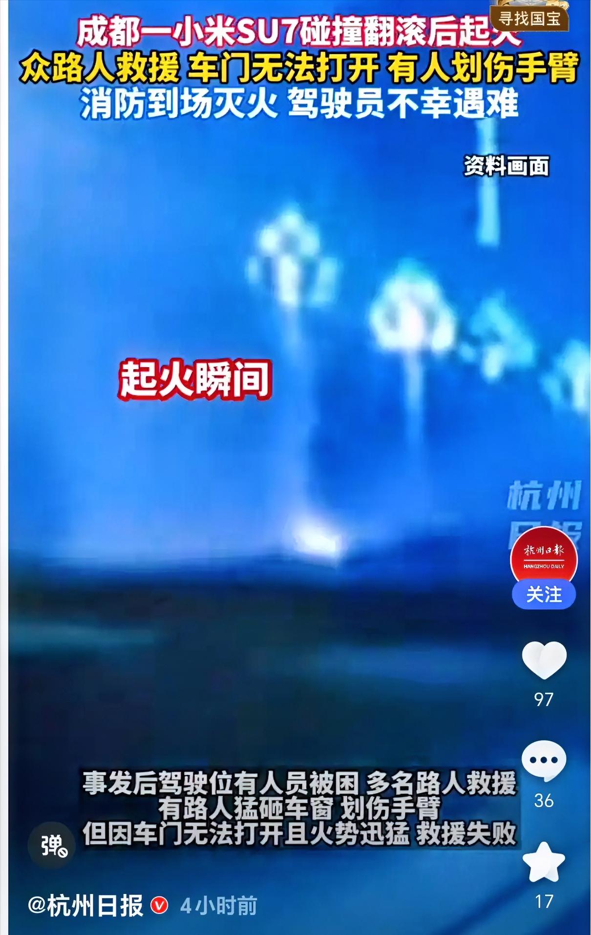 成都小米起火,车主死亡 为什么又是小米su7?其实,你只要注意看小米的用户群就知道了。 小米的用户偏年轻化,喜欢跑车外形,喜欢加速带来的激情,认为小米汽车能带来跑车体验。他们在驾驶过程中,可能会不考虑道路状况,不考虑行车安全,不考虑乘客感受,就来一发激情狂飙。 网友评论: 目前来看,电车安全性还是不能保障,油车还是有他的优越性! 多数人看不清,新能源车企组装好就出售,安全性用无脑消费者试驾,节约时间成本! 买小米汽车基本上都是年轻人,看面相属高调的人群。 国产电车遥遥领先,原来是去阎王那里报道遥遥领先。 刚拿的驾照,技术能好去哪?别说是小米,其他的电车最好都不要开。先买辆二手油车练练,别为了装B,把命搭上了! 年轻人考虑问题轻浮,只看光鲜外表,完全不考虑安全第一! 一个组装公司而己,居然还有人敢去赌命,自找的,怨不得它人。