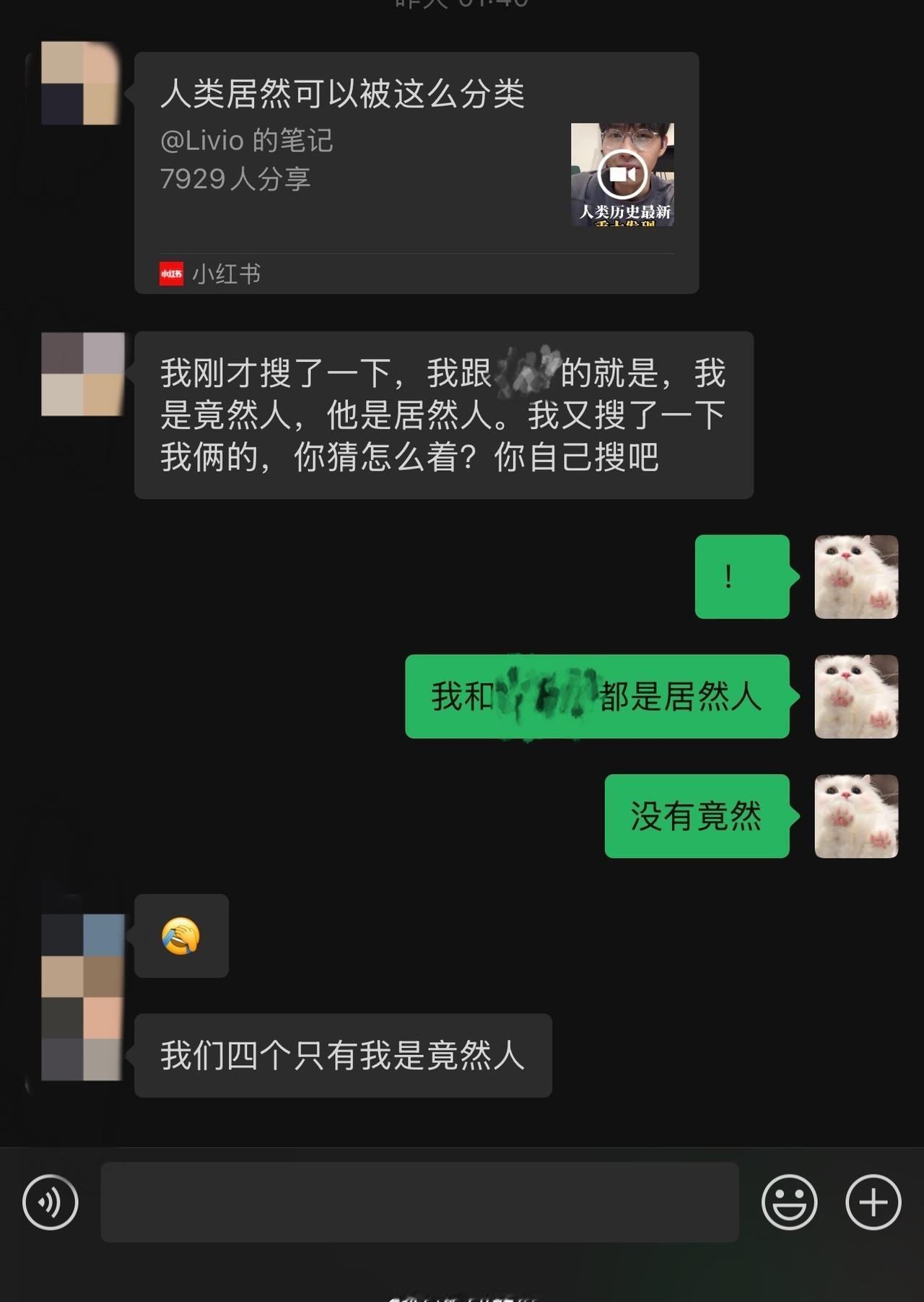 这个世界怎么会这么有趣 大致意思就是人类分成“竟然人”和“居然人” 说竟然的人只会说竟然 说居然的人只会说居然 在夫妻和情侣之间95%的可能性 一个人居然人一个是竟然人 (不过我和小宇都是竟然人 我们没说过居然) 【居然的人偏理性 竟然的人偏感性】 不知道这个准不准 哈哈哈哈哈 有趣