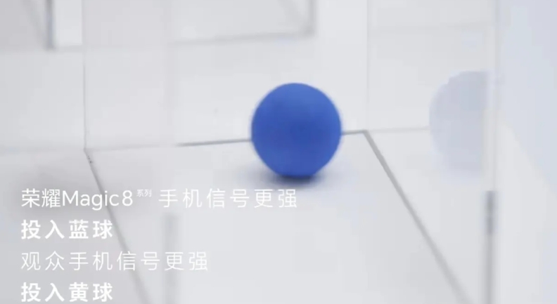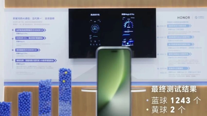 参与活动的用户手机型号来自于市场多家品牌的多个型号,不乏很多今年新上市的旗舰机型。PK规则是每次只要是荣耀Magic8系列机型赢了,用户就投一个蓝色球;如果是用户的手机测试赢了,就投一个黄色球。直到最后PK结束,篮球累计1243个,黄球2个,也就是说整个信号PK测试,1245台不同型号的手机,只有2台手机的信号测试超过了荣耀Magic8系列,全程专人实时记录,所有人都实时见证参与,不得不说Magic8系列机型信号表现太强了。