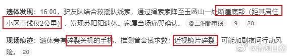 【驴友队在玉函山断崖下发现苏阳阳遗体 】驴友称苏阳阳或因天黑迷路失足坠崖 催婚的压力太大了!不能逼着孩子去走绝路…男子离家29年归家发现被死亡 10月13日下午4点,驴友们在济南玉函山悬崖下面发现了近日失踪的济南29岁男子苏阳阳的遗体 地图显示,驴友队发现遗体的地点距离家直线距离仅2公里左右。 据发现尸体的徐大爷根据路线基本判断,苏阳阳或是因为天黑迷路,着急越过景观步道栏杆寻找路线时候失足。 苏阳阳,今年29岁,济南领秀城居民,211院校毕业,性格内向,生活轨迹简单。10月4日下午,他因被母亲催婚及讨论理发问题后,独自剃光头离家,从济南玉函山公墓进入玉函山后失联。