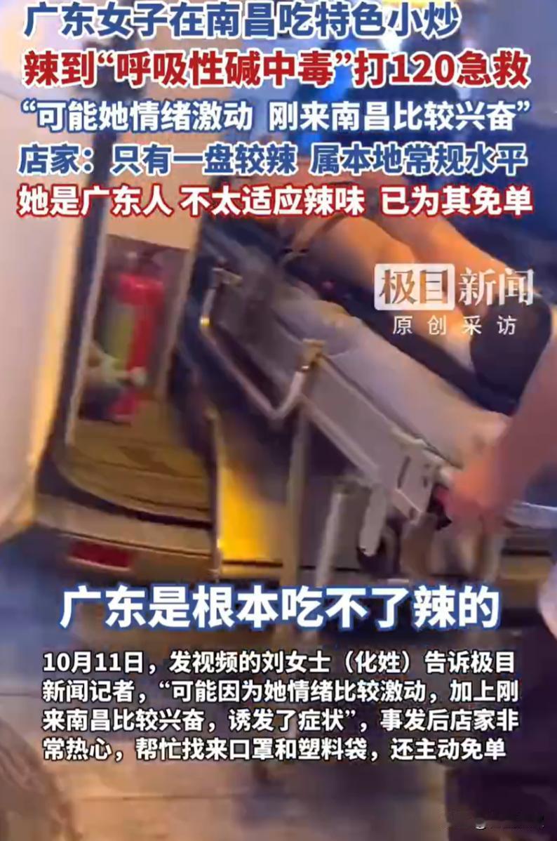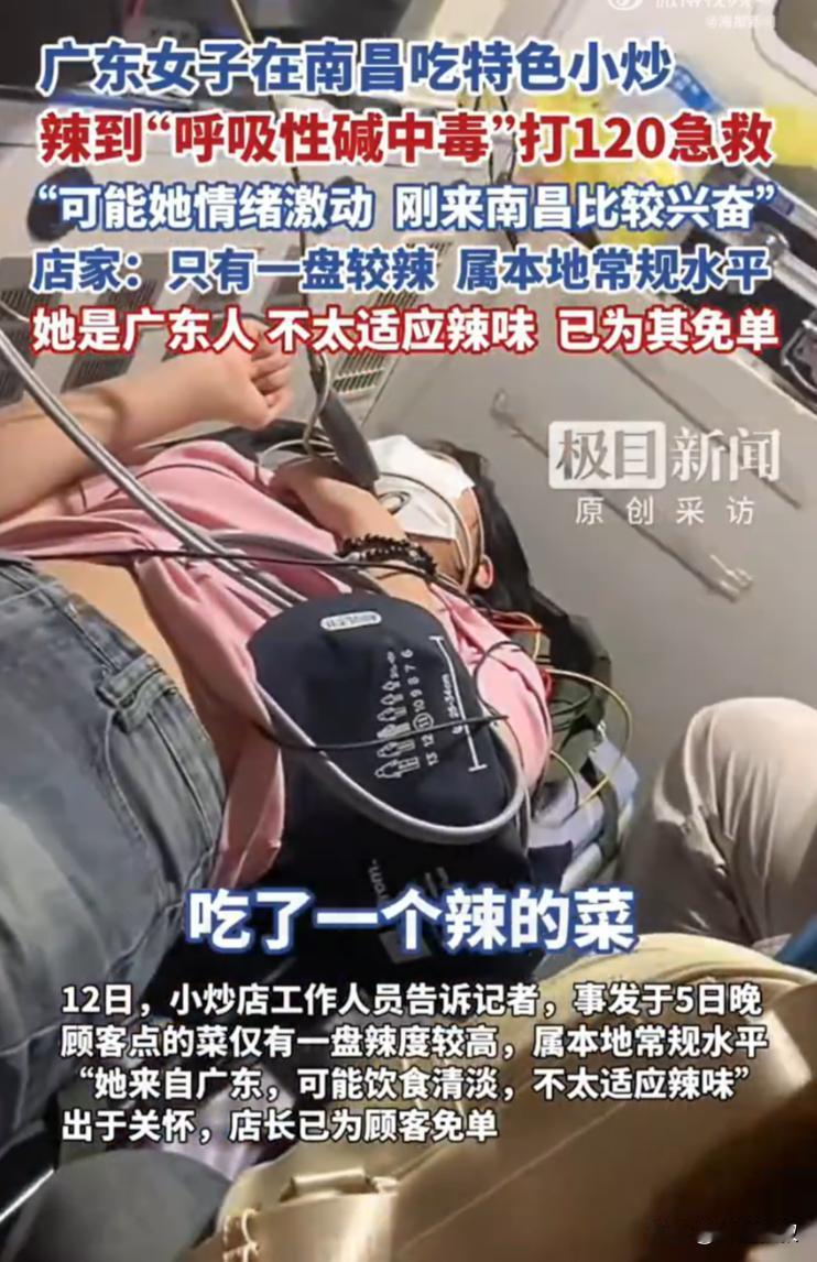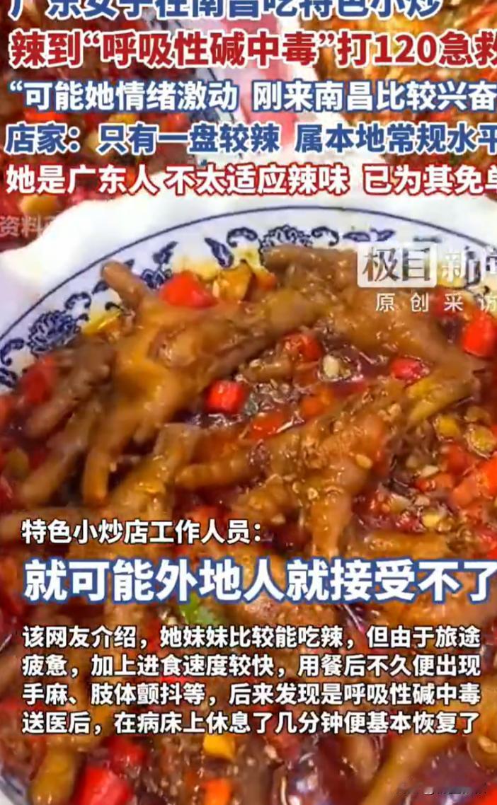 “太高估自己了!”一广东女生去江西看望自己的姐姐,从外地赶来,姐姐自然要带她下馆子吃点特色菜,没想到,女生吃完后突然发生手麻、肢体颤抖的情况,送到医院急救被告知是呼吸性碱中毒,幸运的是在病床上休息了几分钟便基本恢复了。 这女生平时在广东生活,口味跟咱们大多数广东人一样,偏清淡,汤要鲜、菜要嫩,就算偶尔吃点辣,也都是那种微微带点辣意的,比如蒜蓉辣酱、小米辣点缀一下,从来没跟 “重辣” 真刀真枪过招。 这次去江西看姐姐,坐了好几个小时的车,虽然有点累但一见到姐姐,那股子兴奋劲儿就压过了疲惫,姐妹俩拉着手唠个不停。 姐姐知道妹妹难得来一趟,肯定得尽地主之谊,带她尝尝本地的特色,江西人爱吃辣是出了名的,可姐姐也记着妹妹口味淡,特意挑了家口碑好但不算特别辣的小炒店,心里还琢磨着,少点两道辣菜,留几道清淡的,让妹妹既能尝鲜,又不至于受不了。 到了店里姐姐拿着菜单跟服务员反复叮嘱:“这个菜少放辣,那个菜别放辣,就这道本地小炒肉按正常来,让我妹妹尝尝味儿就行。” 女生在旁边听着,还跟姐姐说:“没事姐我平时也能吃点辣,不用太迁就我,你说的那道特色,我也想好好尝尝。” 她当时心里还犯嘀咕,觉得不就是辣嘛,自己偶尔吃火锅也能加两勺辣椒,应该能扛住,压根没把这江西的辣当回事,现在想想真是太高估自己对辣的耐受度了。 菜很快上桌清淡的菜先不说,那道小炒肉一上来,就能闻见一股香辣味儿,油亮亮的肉片裹着红辣椒,看着就特别有食欲,女生夹了一小块肉放进嘴里,刚嚼两口,就觉得嘴里像窜起一股小火苗,辣劲儿直往嗓子眼里冲。 她赶紧端起水杯喝了两口,心里还想着:“好像是比平时吃的辣点,但还行能接受”可没吃几口,那股辣劲儿就跟后劲似的,慢慢冒了出来。 一开始是舌头麻,接着嘴唇也发烫,然后连带着手心脚心都开始发麻,她想忍忍别扫了姐姐的兴,可越忍越不对劲,胳膊开始控制不住地轻微颤抖,呼吸也变得急促起来,说话都有点费劲。 姐姐一看她脸色不对,嘴唇发白手还在抖,吓得赶紧放下筷子:“你怎么了?是不是辣着了?” 女生点点头,想说 “有点难受”,可话没说完,就觉得眼前有点发晕。 姐姐也顾不上别的,赶紧掏出手机叫车,拉着她往医院赶,一路上都在跟她说 “别慌别慌,马上到医院了”。 到了医院,医生赶紧给她做检查,量血压、听心肺,折腾了一会儿,诊断结果出来了,呼吸性碱中毒,女生当时一听 “中毒” 俩字,吓得心里一紧,医生赶紧解释:“不是真的食物中毒,就是你吃了太辣的东西刺激到了,呼吸太快太急,导致血液里的二氧化碳浓度太低,才会手麻、发抖,不算严重,别担心。” 然后医生让她躺在病床上,拿了个纸袋子罩在嘴边,让她慢慢深呼吸,说这样能把呼出的二氧化碳再吸回去点缓解症状。 女生照着做,躺了大概五六分钟,手不麻了也不抖了,呼吸也平稳下来,除了嘴里还有点辣意的残留,别的不适感基本都没了。 后来姐妹俩回想起这事儿,还挺后怕的,姐姐说:“早知道你这么不耐受,我就不让你尝那道辣菜了。” 女生自己也说:“都怪我太高估自己了,以为平时吃点辣就叫能吃辣,跟江西的辣比起来,那根本不算事儿。” 而且医生还说她当时刚赶完路,身体本来就累,又因为见到姐姐太兴奋,身体状态不算好,这也加重了不适的反应,更暖心的是等她们从医院回去,店家知道了这事儿,还主动把那顿饭钱给免了,说没想到让客人吃着不舒服,挺过意不去的。 女生后来跟朋友聊起这事儿,总说:“以后可不敢随便挑战自己不熟悉的口味了,尤其是辣,得顺着自己的身体来,可别再干这种高估自己的傻事了。” (信息来源:长江云新闻)