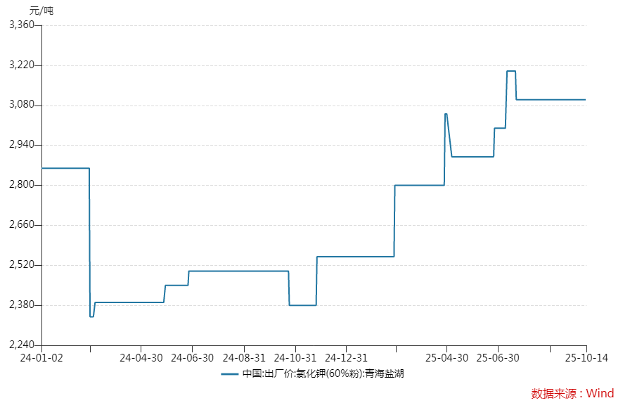 Wind数据显示,2024年末青海盐湖氯化钾(60%粉)出厂价为2550元/吨,今年7月中旬时已经升至3200元/吨,此后一直维持在3100元/吨至今。