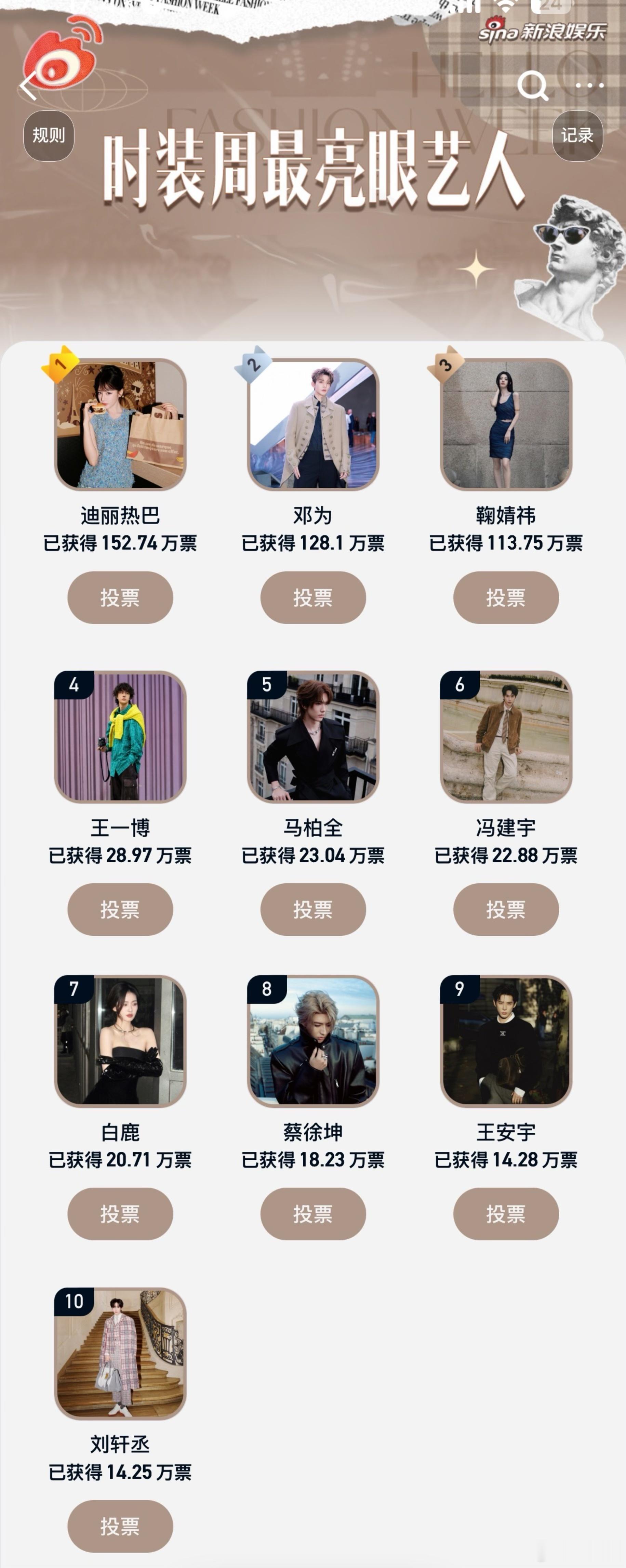 2026春夏时装周最亮眼艺人TOP10 出炉!谁是你心中的潮流风向标?[打call] 截至10月16日,共同见证时装周人气艺人TOP1的诞生,最终结果将于10月17日揭晓综合TOP3[好喜欢] 投票戳 Hello时装周
